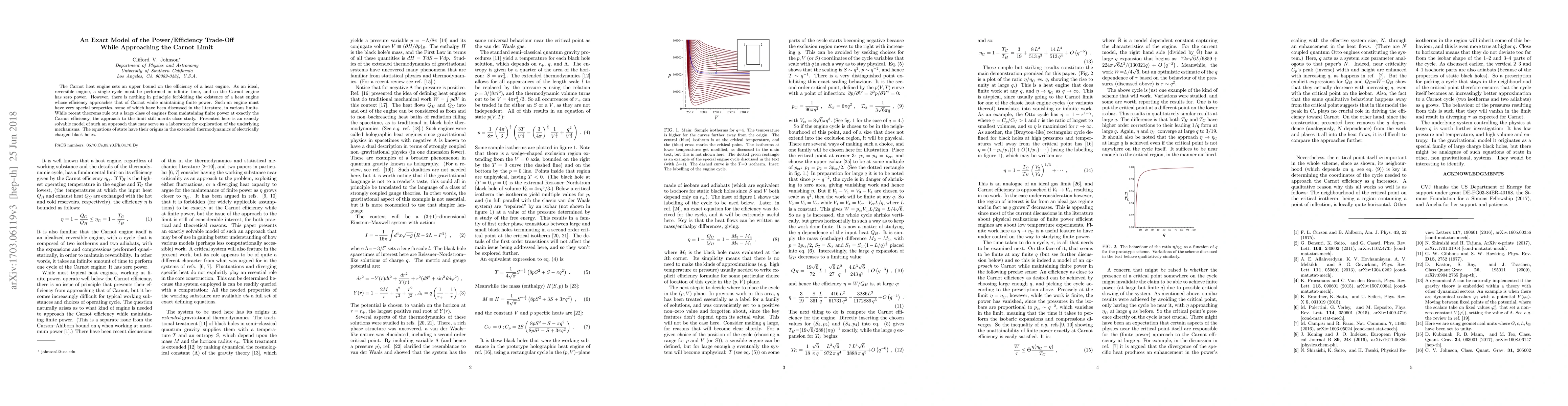 The Carnot heat engine sets an upper bound on the efficiency of a heat engine. As an ideal, reversible engine, a single cycle must be performed in infinite time, and so the Carnot engine has zero power. However, there is nothing in principle forbidding the existence of a heat engine whose efficiency approaches that of Carnot while maintaining finite power. Such an engine must have very special properties, some of which have been discussed in the literature, in various limits. While recent theorems rule out a large class of engines from maintaining finite power at exactly the Carnot efficiency, the approach to the limit still merits close study. Presented here is an exactly solvable model of such an approach that may serve as a laboratory for exploration of the underlying mechanisms. The equations of state have their origins in the extended thermodynamics of electrically charged black holes.
