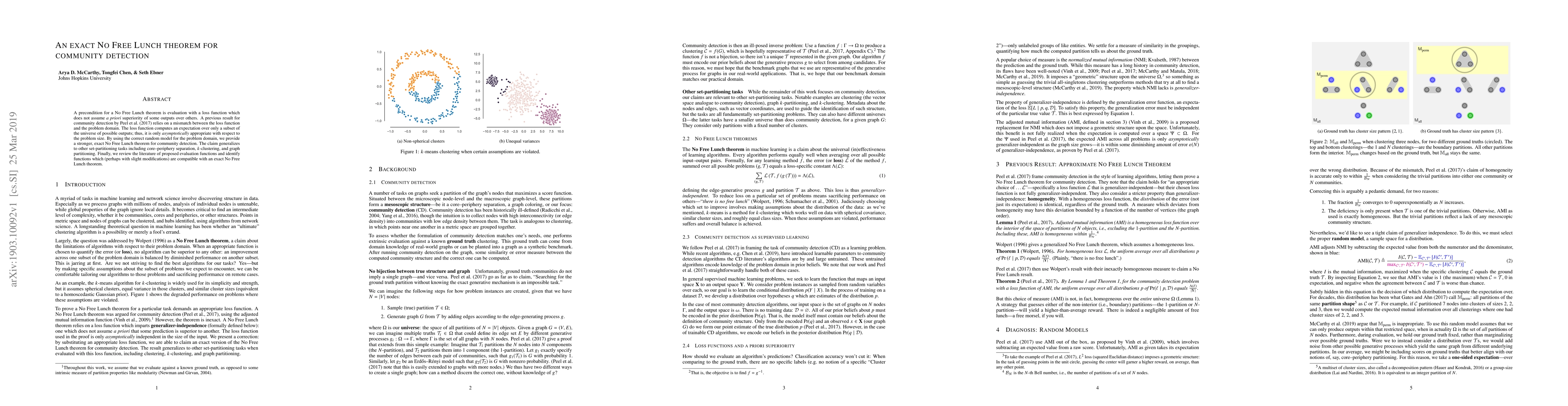 A precondition for a No Free Lunch theorem is evaluation with a loss function which does not assume a priori superiority of some outputs over others. A previous result for community detection by Peel et al. (2017) relies on a mismatch between the loss function and the problem domain. The loss function computes an expectation over only a subset of the universe of possible outputs; thus, it is only asymptotically appropriate with respect to the problem size. By using the correct random model for the problem domain, we provide a stronger, exact No Free Lunch theorem for community detection. The claim generalizes to other set-partitioning tasks including core/periphery separation, $k$-clustering, and graph partitioning. Finally, we review the literature of proposed evaluation functions and identify functions which (perhaps with slight modifications) are compatible with an exact No Free Lunch theorem.