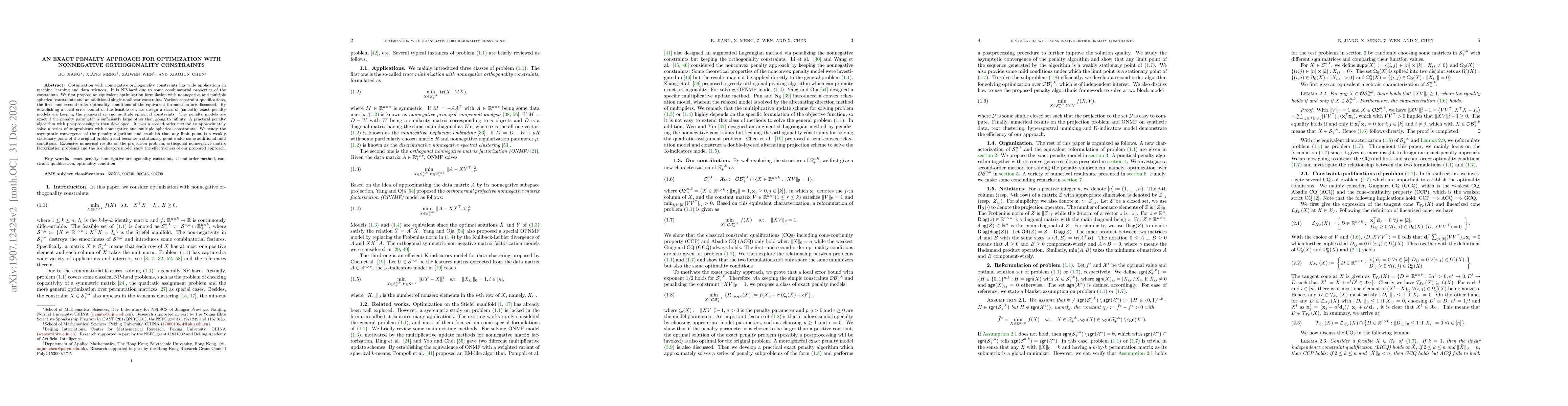 Optimization with nonnegative orthogonality constraints has wide applications in machine learning and data sciences. It is NP-hard due to some combinatorial properties of the constraints. We first propose an equivalent optimization formulation with nonnegative and multiple spherical constraints and an additional single nonlinear constraint. Various constraint qualifications, the first- and second-order optimality conditions of the equivalent formulation are discussed. By establishing a local error bound of the feasible set, we design a class of (smooth) exact penalty models via keeping the nonnegative and multiple spherical constraints. The penalty models are exact if the penalty parameter is sufficiently large other than going to infinity. A practical penalty algorithm with postprocessing is then developed. It uses a second-order method to approximately solve a series of subproblems with nonnegative and multiple spherical constraints. We study the asymptotic convergence of the penalty algorithm and establish that any limit point is a weakly stationary point of the original problem and becomes a stationary point under some additional mild conditions. Extensive numerical results on the projection problem, orthogonal nonnegative matrix factorization problems and the K-indicators model show the effectiveness of our proposed approach.