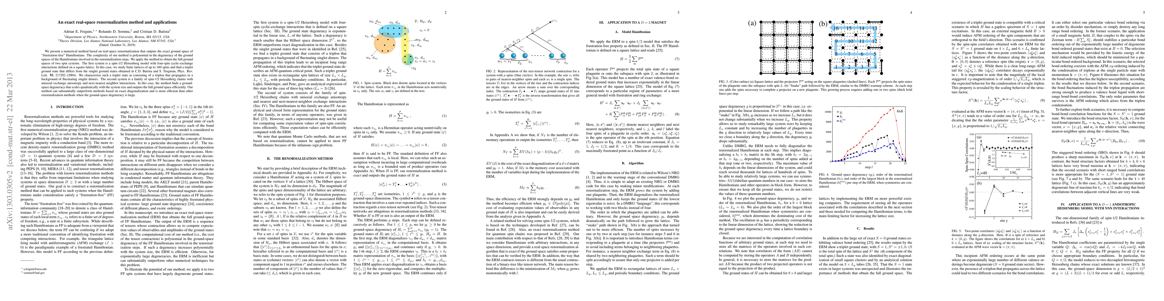 We present a numerical method based on real-space renormalization that outputs the exact ground space of "frustration-free" Hamiltonians. The complexity of our method is polynomial in the degeneracy of the ground spaces of the Hamiltonians involved in the renormalization steps. We apply the method to obtain the full ground spaces of two spin systems. The first system is a spin-1/2 Heisenberg model with four-spin cyclic-exchange interactions defined on a square lattice. In this case, we study finite lattices of up to 160 spins and find a triplet ground state that differs from the singlet ground states obtained in C.D. Batista and S. Trugman, Phys. Rev. Lett. 93, 217202 (2004). We characterize such a triplet state as consisting of a triplon that propagates in a background of fluctuating singlet dimers. The second system is a family of spin-1/2 Heisenberg chains with uniaxial exchange anisotropy and next-nearest neighbor interactions. In this case, the method finds a ground-space degeneracy that scales quadratically with the system size and outputs the full ground space efficiently. Our method can substantially outperform methods based on exact diagonalization and is more efficient than other renormalization methods when the ground-space degeneracy is large.