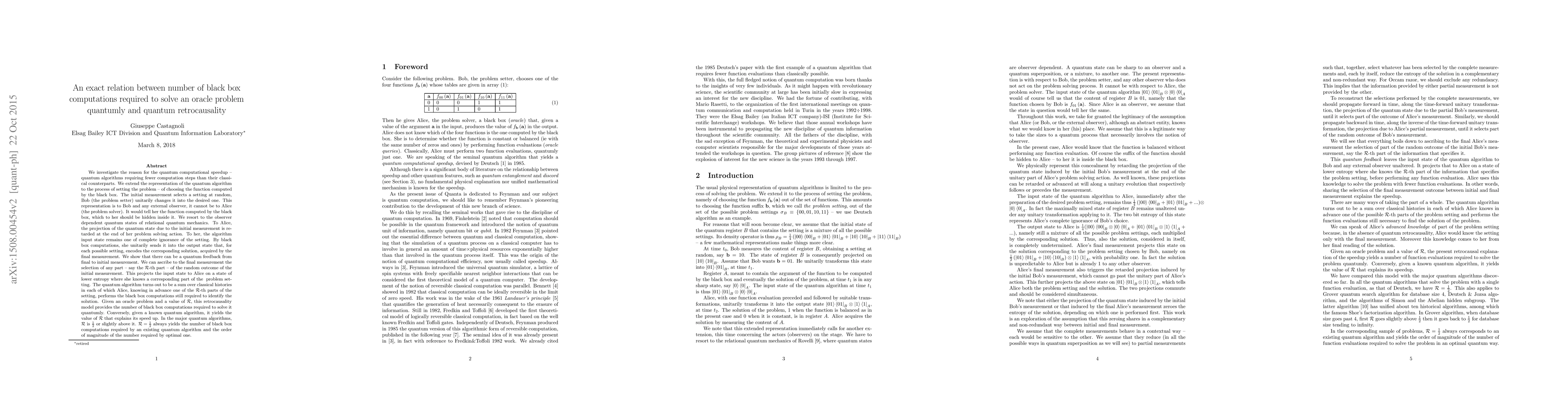 We investigate the reason for the quantum speedup -- quantum algorithms requiring fewer computation steps than their classical counterparts. We extend their representation to the process of setting the problem. The initial measurement selects a setting at random, Bob (the problem setter) unitarily changes it into the desired one. This representation is to Bob and any external observer, it cannot be to Alice (the problem solver). It would tell her the function computed by the black box, which to her should be hidden inside it. We resort to relational quantum mechanics. To Alice, the projection of the quantum state due to the initial measurement is retarded at the end of her problem solving action. To her, the algorithm input state remains one of complete ignorance of the setting. By black box computations, she unitarily sends it into the output state that, for each possible setting, encodes the corresponding solution, acquired by the final measurement. We show that we can ascribe to the final measurement the selection of any part -- say the R-th part -- of the random outcome of the initial measurement. This projects the input state to Alice on a state of lower entropy where she knows a corresponding part of the problem setting. The quantum algorithm is a sum over classical histories in each of which Alice, knowing in advance one of the R-th parts of the setting, performs the black box computations still required to identify the solution. Given an oracle problem and a value of R, this retrocausality model provides the number of black box computations required to solve it. Conversely, given a known quantum algorithm, it yields the value of R that explains its speed up. R = 1/2 always yields the number of black box computations required by an existing quantum algorithm and the order of magnitude of the number required by optimal one.