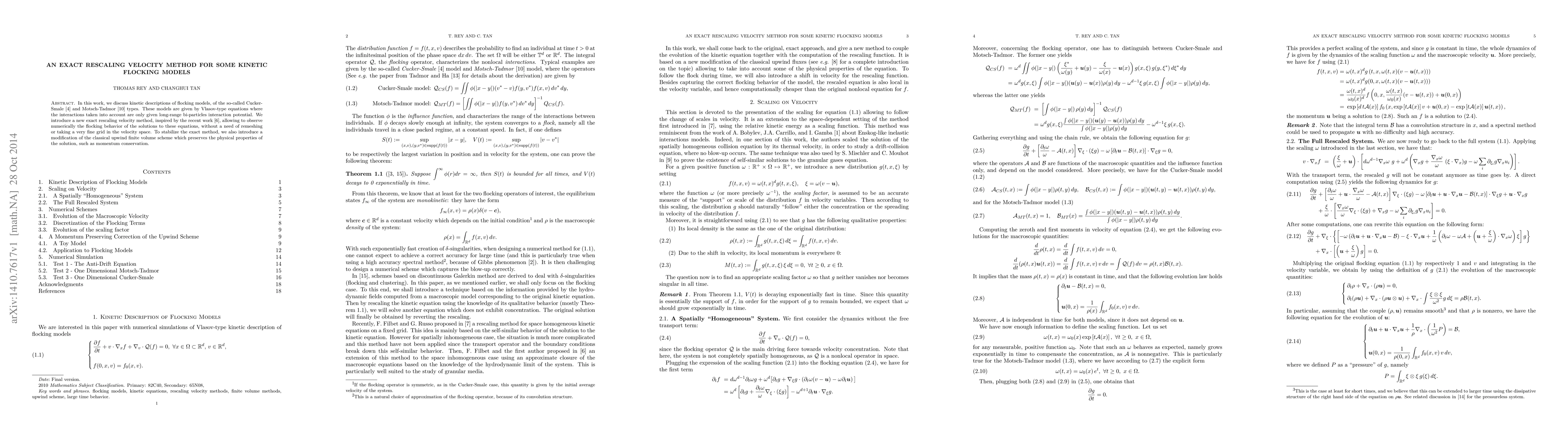 This paper introduces a new exact rescaling velocity method for kinetic flocking models, specifically for Cucker-Smale and Motsch-Tadmor types, enabling numerical observation of flocking behavior without the need for fine grids. The method also incorporates a modified upwind finite volume scheme to maintain physical properties like momentum conservation.