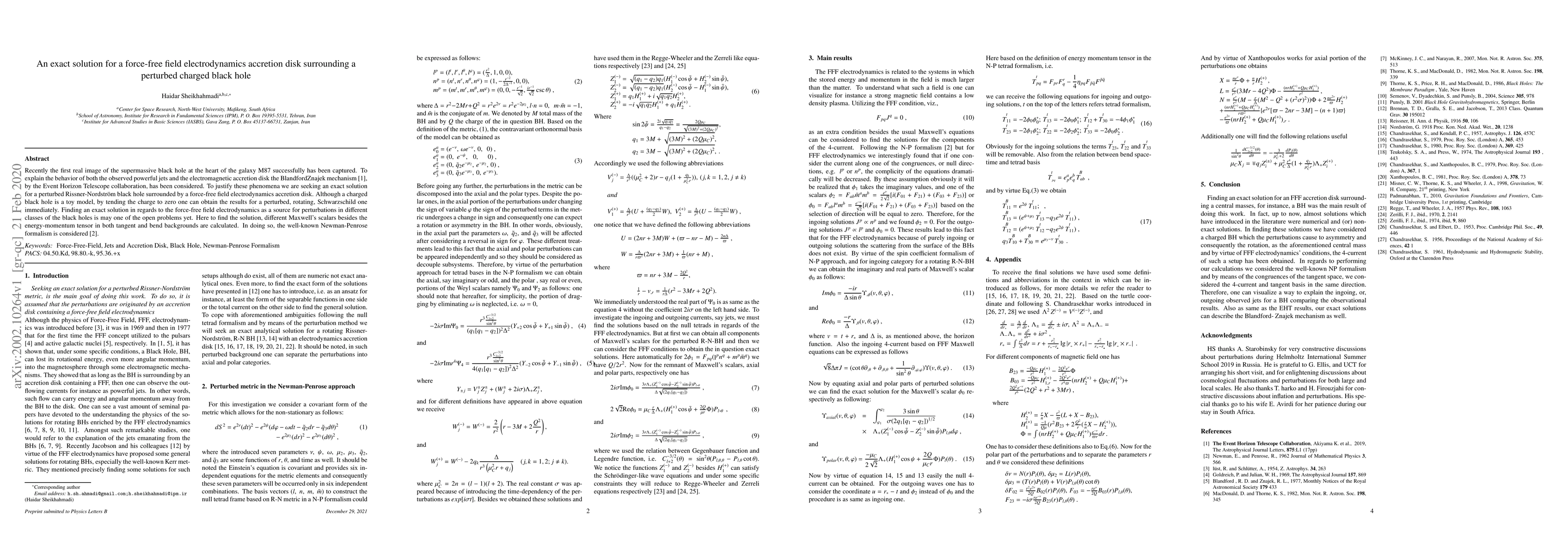 Researchers seek an exact solution for a perturbed Rissner-Nordstrom black hole surrounded by a force-free field electrodynamics accretion disk to understand powerful jets and electromagnetic phenomena observed in M87 galaxy.