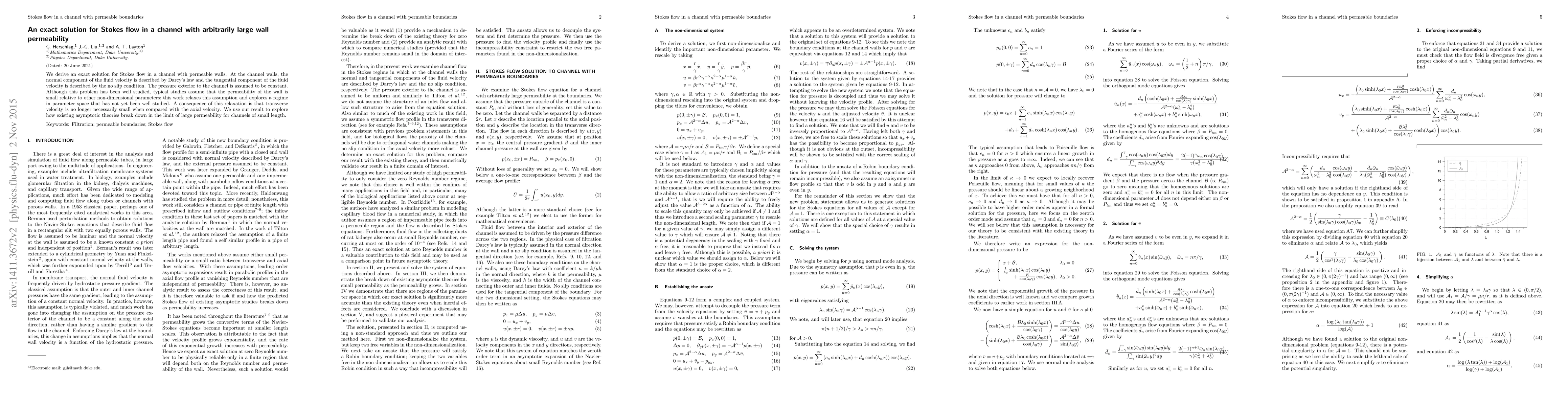 Researchers derived an exact solution for fluid flow in a channel with large permeability walls, exploring a regime not previously studied, and found that transverse velocity can no longer be assumed small.