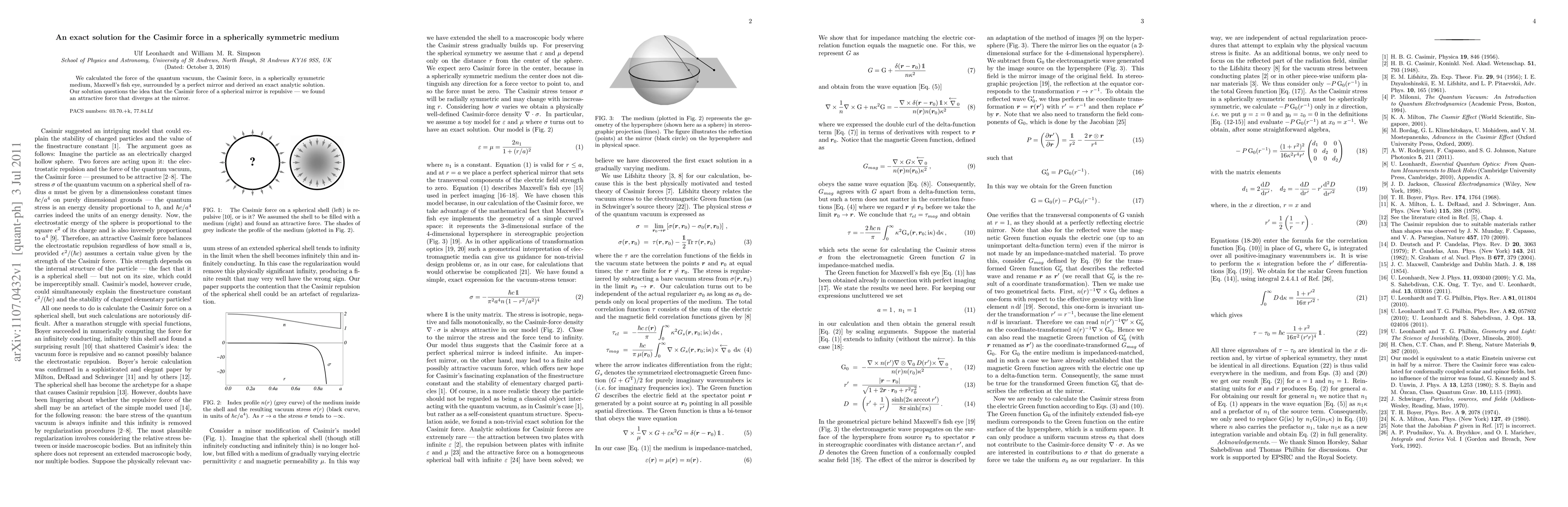 We calculated the force of the quantum vacuum, the Casimir force, in a spherically symmetric medium, Maxwell's fish eye, surrounded by a perfect mirror and derived an exact analytic solution. Our solution questions the idea that the Casimir force of a spherical mirror is repulsive - we found an attractive force that diverges at the mirror.