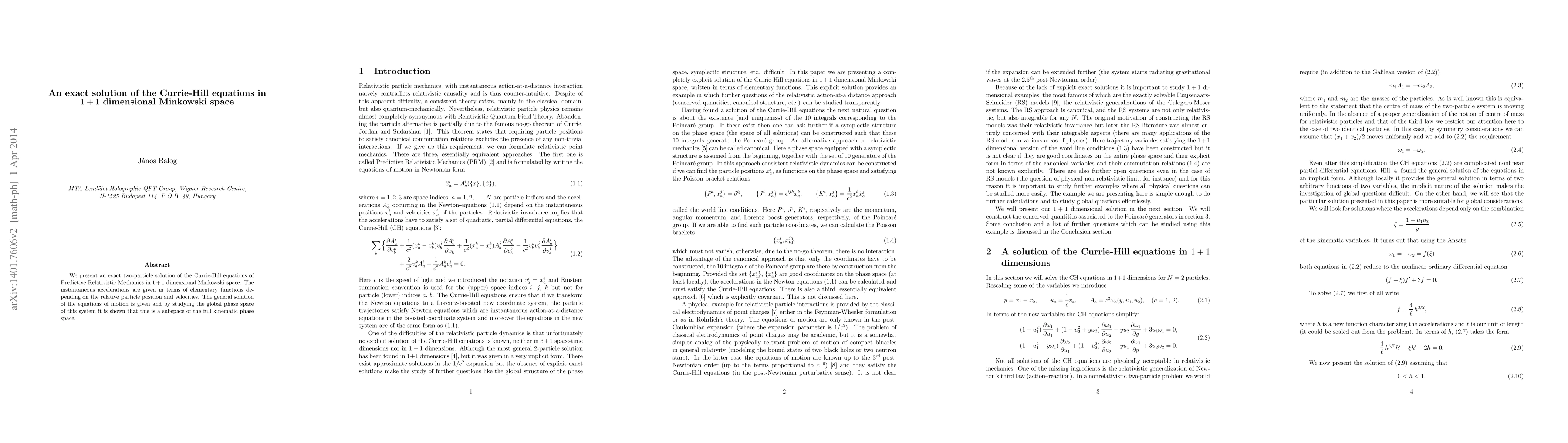 We present an exact two-particle solution of the Currie-Hill equations of Predictive Relativistic Mechanics in $1 + 1$ dimensional Minkowski space. The instantaneous accelerations are given in terms of elementary functions depending on the relative particle position and velocities. The general solution of the equations of motion is given and by studying the global phase space of this system it is shown that this is a subspace of the full kinematic phase space.