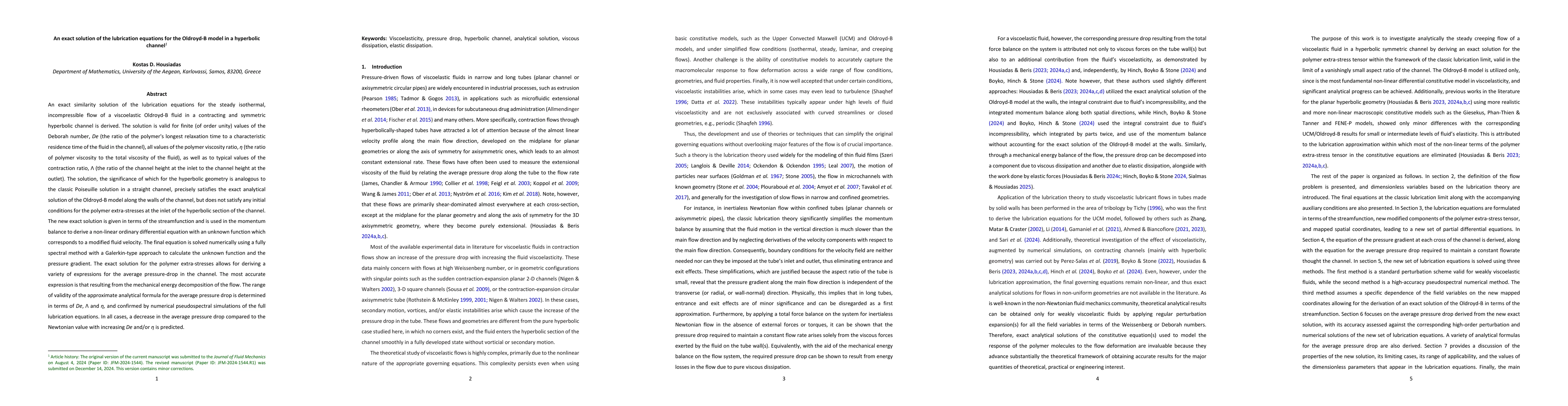 The paper presents an exact similarity solution for the lubrication equations of an Oldroyd-B fluid in a hyperbolic channel, derived using transformed coordinates and new components of the polymer extra-stress tensor, along with methods for numerically solving the resulting equations.