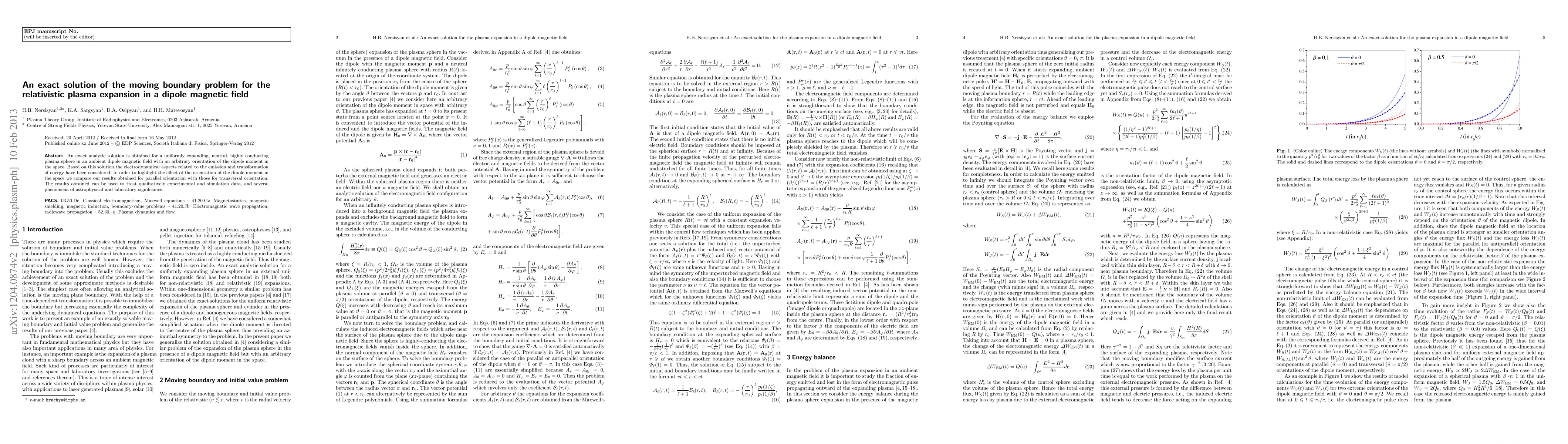An exact analytic solution is obtained for a uniformly expanding, neutral, highly conducting plasma sphere in an ambient dipole magnetic field with an arbitrary orientation of the dipole moment in the space. Based on this solution the electrodynamical aspects related to the emission and transformation of energy have been considered. In order to highlight the effect of the orientation of the dipole moment in the space we compare our results obtained for parallel orientation with those for transversal orientation. The results obtained can be used to treat qualitatively experimental and simulation data, and several phenomena of astrophysical and laboratory significance.
