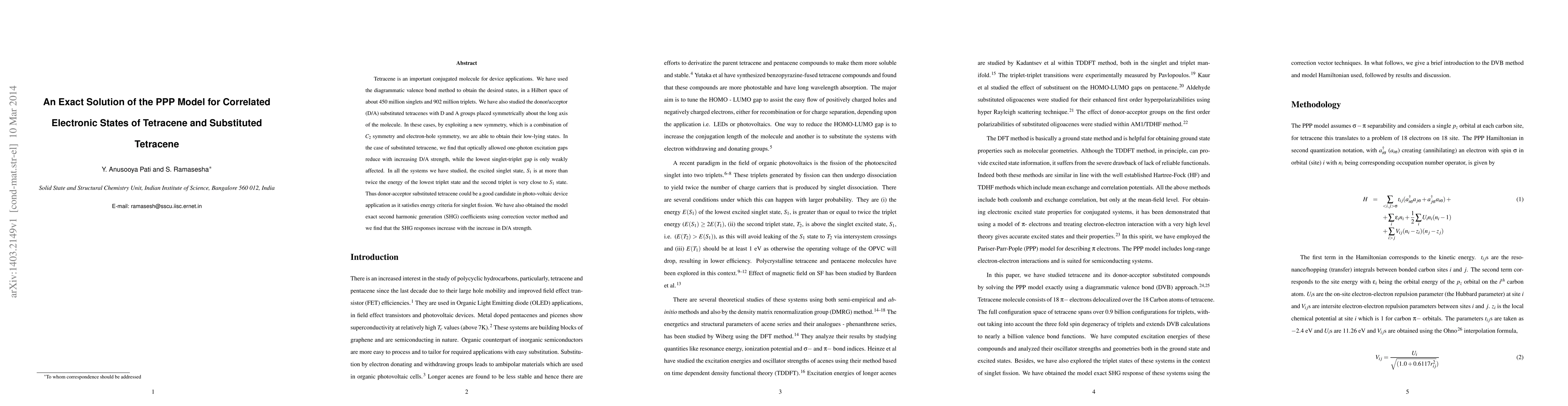 Tetracene is an important conjugated molecule for device applications. We have used the diagrammatic valence bond method to obtain the desired states, in a Hilbert space of about 450 million singlets and 902 million triplets. We have also studied the donor/acceptor (D/A) substituted tetracenes with D and A groups placed symmetrically about the long axis of the molecule. In these cases, by exploiting a new symmetry, which is a combination of $C_2$ symmetry and electron-hole symmetry, we are able to obtain their low-lying states. In the case of substituted tetracene, we find that optically allowed one-photon excitation gaps reduce with increasing D/A strength, while the lowest singlet-triplet gap is only weakly affected. In all the systems we have studied, the excited singlet state, $S_1$ is at more than twice the energy of the lowest triplet state and the second triplet is very close to $S_1$ state. Thus donor-acceptor substituted tetracene could be a good candidate in photo-voltaic device application as it satisfies energy criteria for singlet fission. We have also obtained the model exact second harmonic generation (SHG) coefficients using correction vector method and we find that the SHG responses increase with the increase in D/A strength.