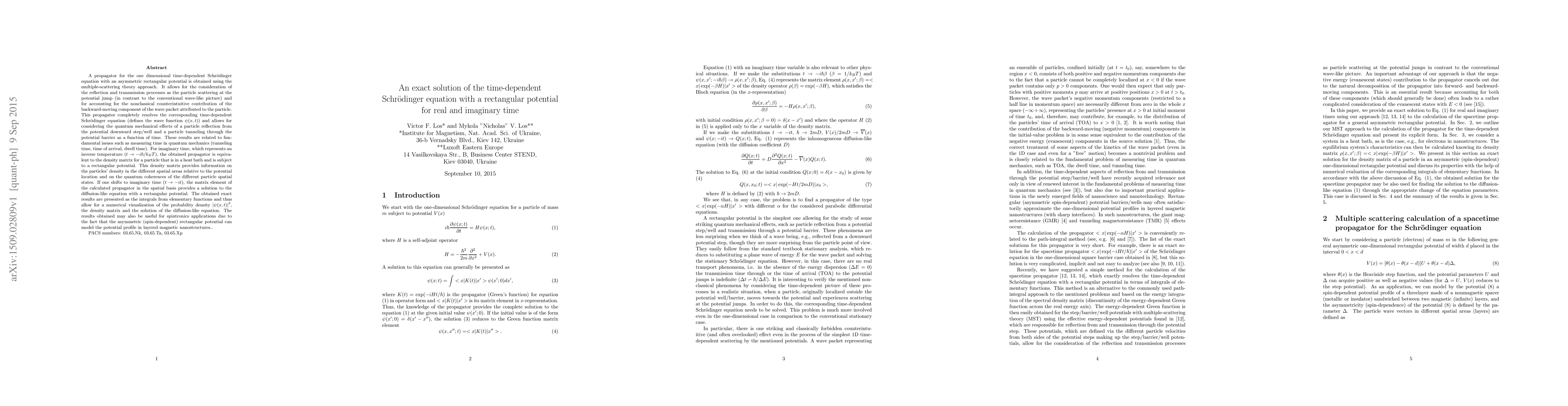 This paper presents an exact solution for the time-dependent Schrödinger equation with an asymmetric rectangular potential using multiple-scattering theory, resolving quantum mechanical effects such as reflection and tunneling. It also provides an equivalent density matrix for imaginary time, useful for modeling spintronics in magnetic nanostructures.