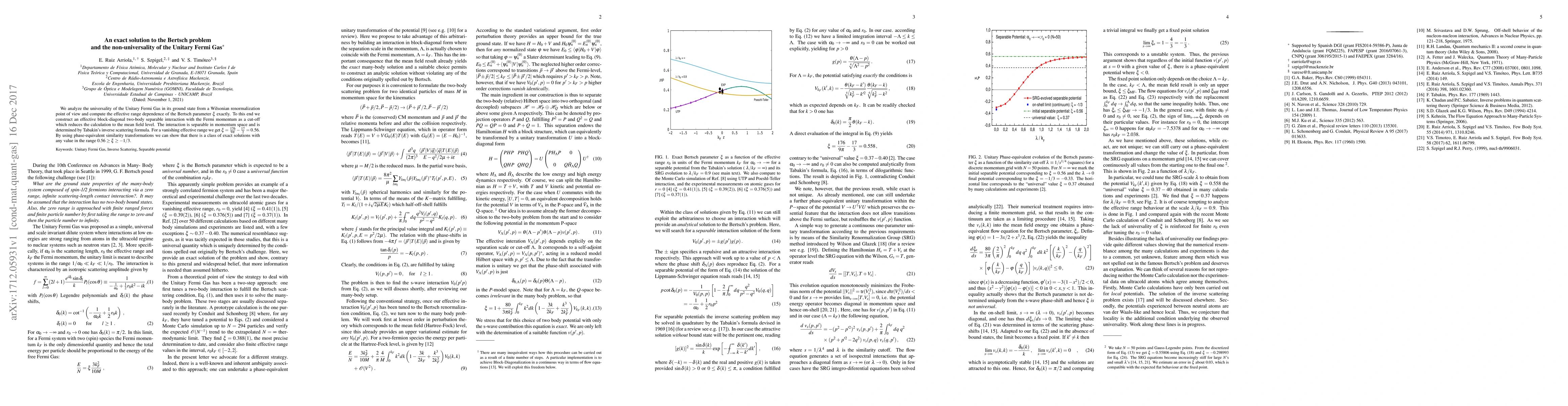 We analyze the universality of the Unitary Fermi Gas in its ground state from a Wilsonian renormalization point of view and compute the effective range dependence of the Bertsch parameter $\xi$ exactly. To this end we construct an effective block-diagonal two-body separable interaction with the Fermi momentum as a cut-off which reduces the calculation to the mean field level. The interaction is separable in momentum space and is determined by Tabakin's inverse scattering formula. For a vanishing effective range we get $\xi = \frac{176}{9 \pi }-\frac{17}{3} = 0.56$. By using phase-equivalent similarity transformations we can show that there is a class of exact solutions with any value in the range $ 0.56 \ge \xi \ge -1/3$.
