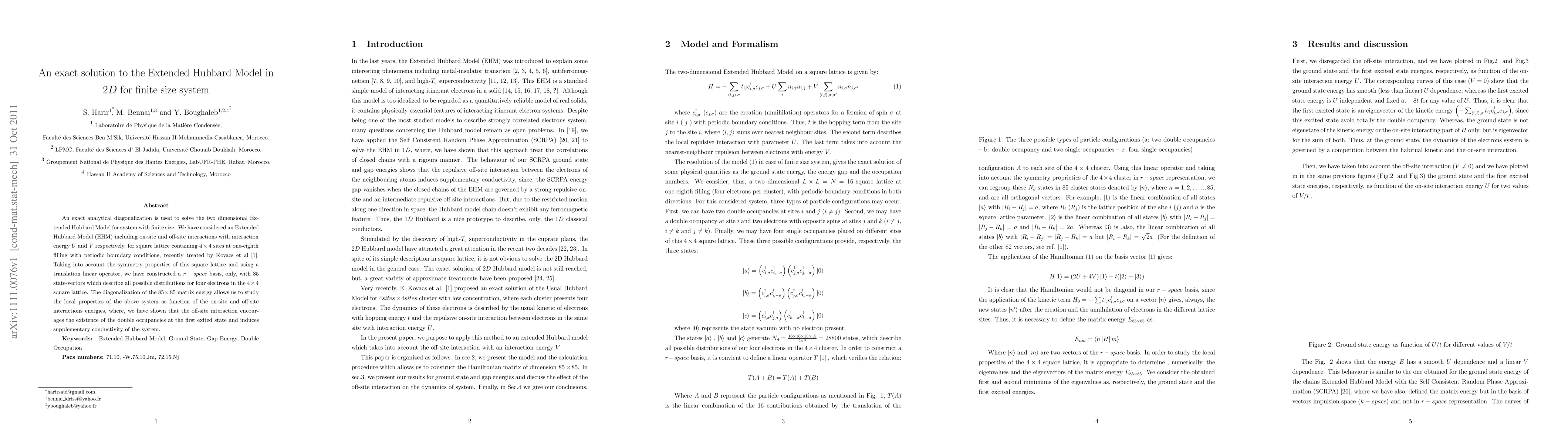This paper presents an exact analytical diagonalization of the 2D Extended Hubbard Model for a finite-size 4*4 square lattice system, revealing the effects of on-site and off-site interactions on the local properties and conductivity of the system, particularly highlighting the role of off-site interactions in promoting double occupancies and additional conductivity.
