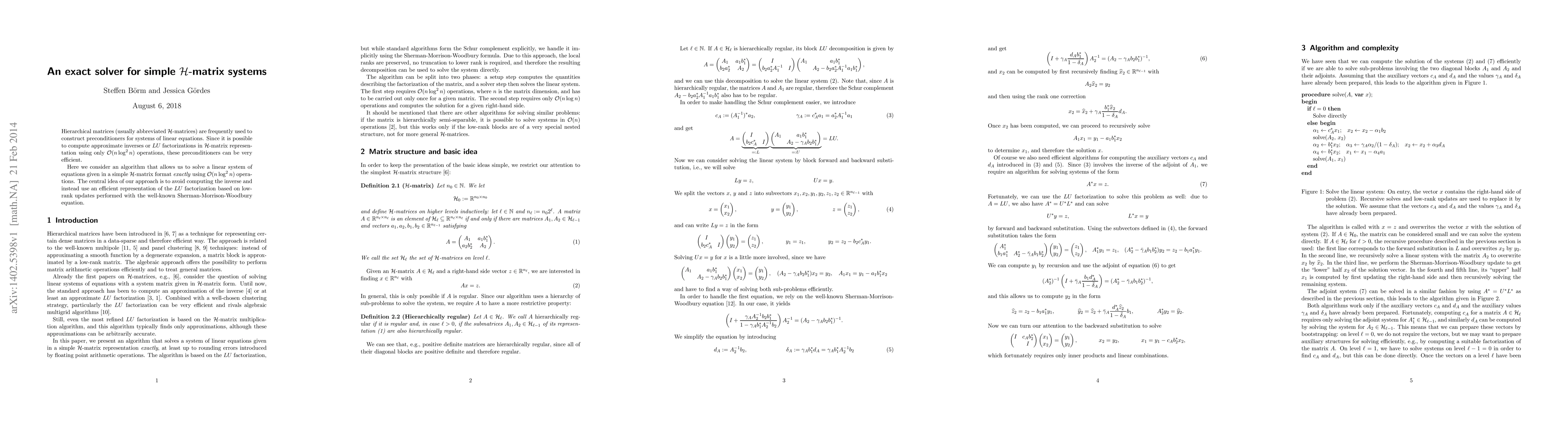 This paper presents an exact solver for linear systems in simple ${\mathcal H}$-matrix format, achieving ${\mathcal O}(n \log^2 n)$ operations. The method avoids computing the inverse directly and instead employs an efficient representation of the $LU$ factorization using low-rank updates via the Sherman-Morrison-Woodbury formula.