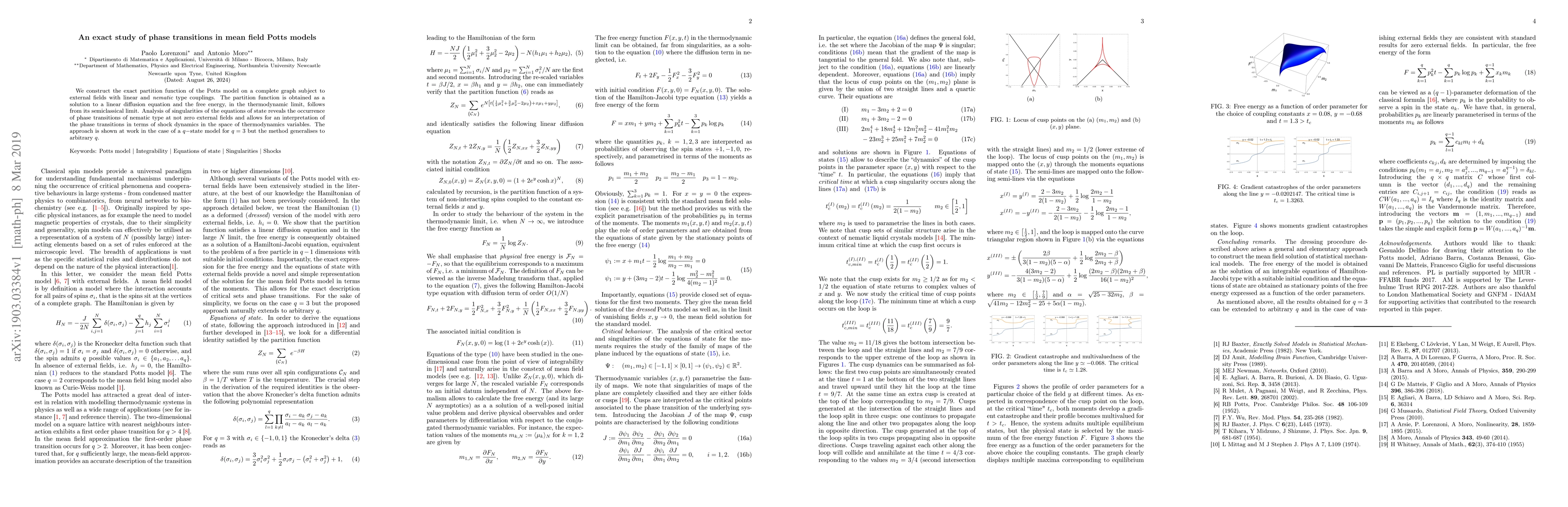 We construct the exact partition function of the Potts model on a complete graph subject to external fields with linear and nematic type couplings. The partition function is obtained as a solution to a linear diffusion equation and the free energy, in the thermodynamic limit, follows from its semiclassical limit. Analysis of singularities of the equations of state reveals the occurrence of phase transitions of nematic type at not zero external fields and allows for an interpretation of the phase transitions in terms of shock dynamics in the space of thermodynamics variables. The approach is shown at work in the case of a q-state model for q=3 but the method generalises to arbitrary q.
