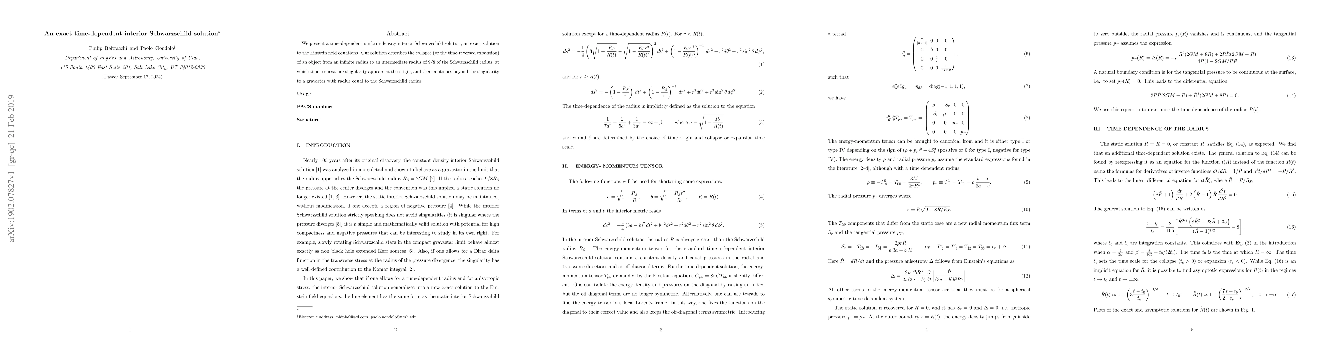 We present a time-dependent uniform-density interior Schwarzschild solution, an exact solution to the Einstein field equations. Our solution describes the collapse (or the time-reversed expansion) of an object from an infinite radius to an intermediate radius of 9/8 of the Schwarzschild radius, at which time a curvature singularity appears at the origin, and then continues beyond the singularity to a gravastar with radius equal to the Schwarzschild radius.
