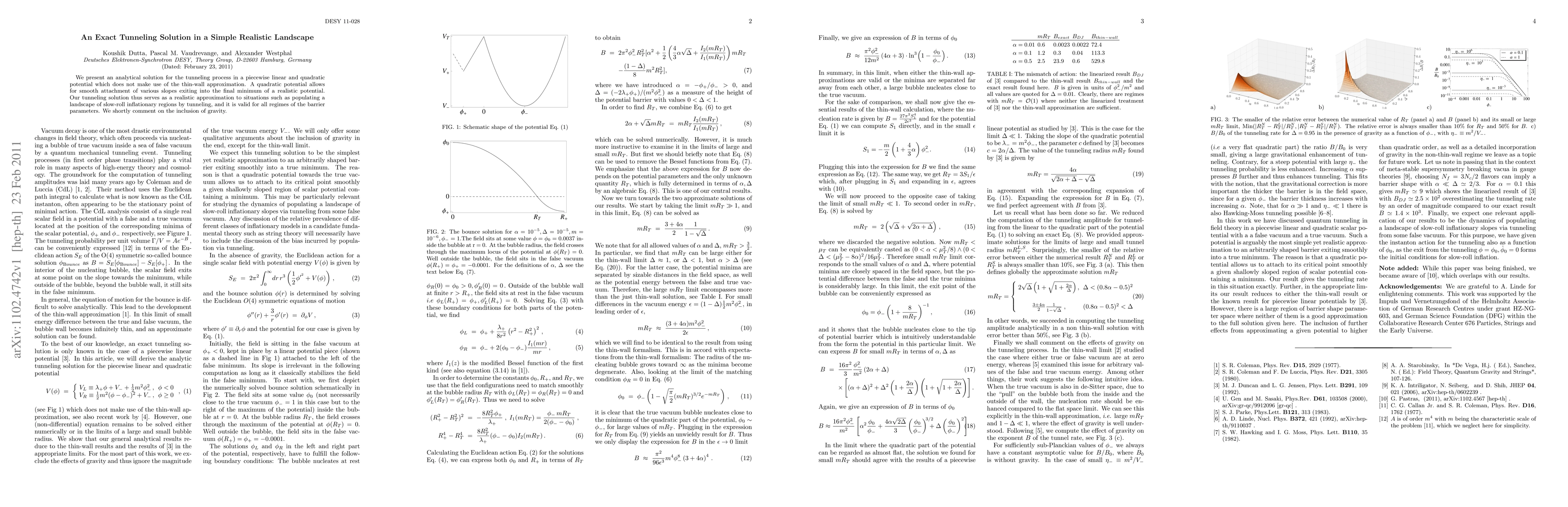This paper provides an exact analytical solution for tunneling in a piecewise linear and quadratic potential, valid for all barrier regimes without relying on the thin-wall approximation. The solution offers a realistic approximation for tunneling in inflationary landscapes and briefly discusses its implications for gravitational inclusion.
