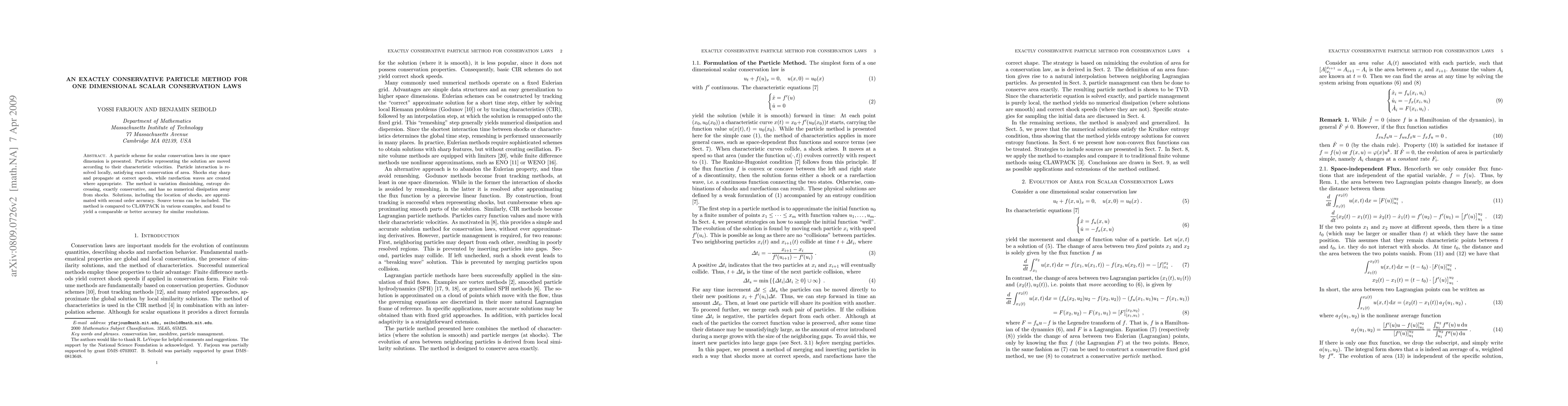 This paper introduces a particle method for solving one-dimensional scalar conservation laws, ensuring exact conservation, sharp shock propagation, and second-order accuracy. The method is compared to CLAWPACK, showing comparable or superior accuracy.
