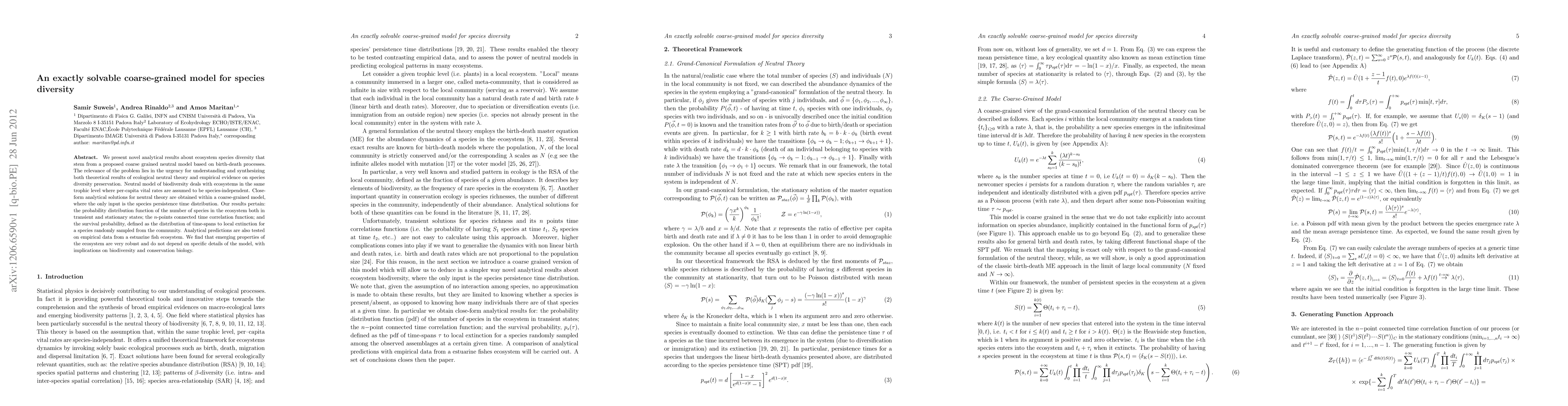 We present novel analytical results about ecosystem species diversity that stem from a proposed coarse grained neutral model based on birth-death processes. The relevance of the problem lies in the urgency for understanding and synthesizing both theoretical results of ecological neutral theory and empirical evidence on species diversity preservation. Neutral model of biodiversity deals with ecosystems in the same trophic level where per-capita vital rates are assumed to be species-independent. Close-form analytical solutions for neutral theory are obtained within a coarse-grained model, where the only input is the species persistence time distribution. Our results pertain: the probability distribution function of the number of species in the ecosystem both in transient and stationary states; the n-points connected time correlation function; and the survival probability, definned as the distribution of time-spans to local extinction for a species randomly sampled from the community. Analytical predictions are also tested on empirical data from a estuarine fish ecosystem. We find that emerging properties of the ecosystem are very robust and do not depend on specific details of the model, with implications on biodiversity and conservation biology.