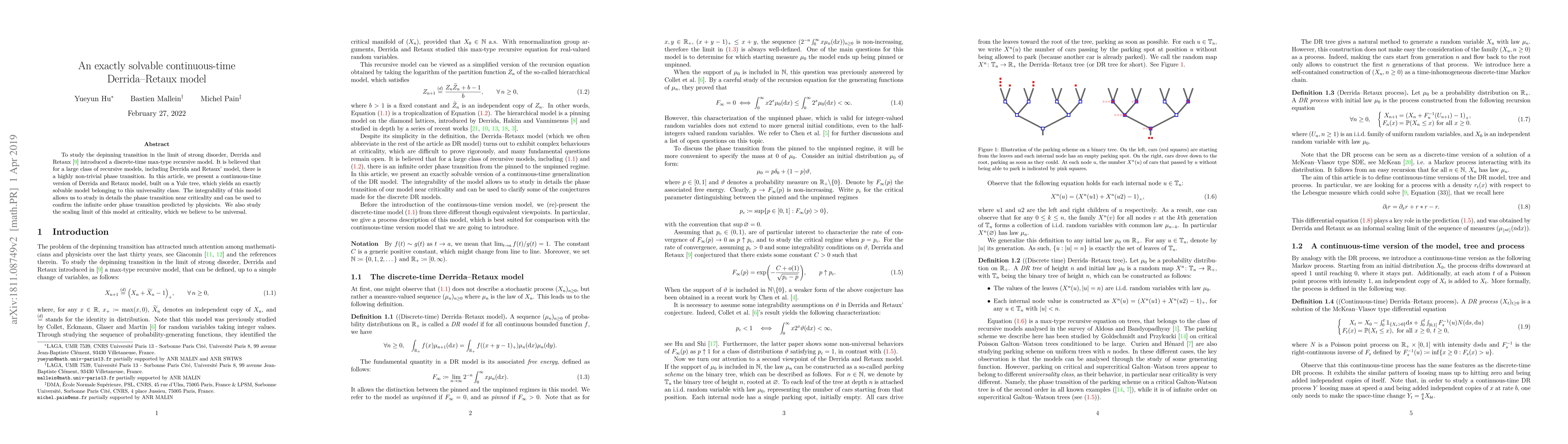 This paper presents a continuous-time version of the Derrida--Retaux model, built on a Yule tree, which allows for exact solutions. The model's integrability enables detailed study of the depinning transition near criticality, confirming the predicted infinite order phase transition.