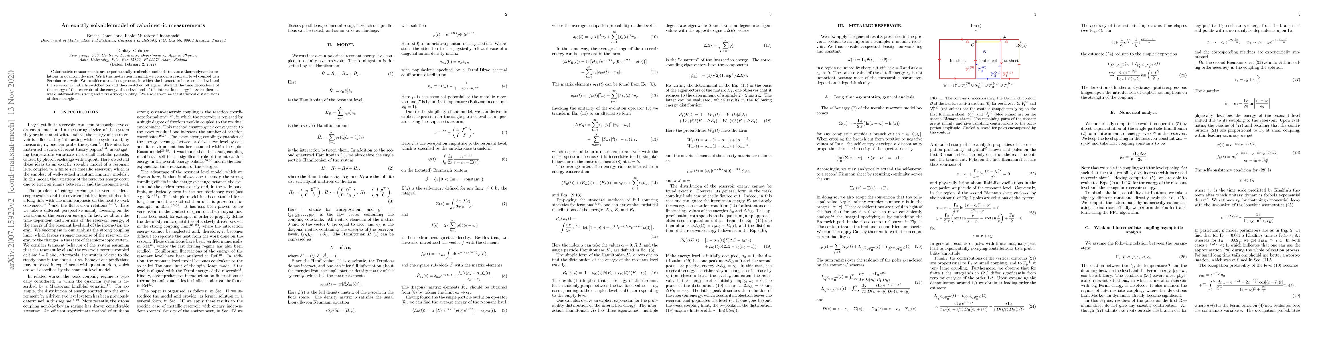 Researchers model calorimetric measurements in quantum devices, finding time-dependent energy distributions for a resonant level coupled to a Fermion reservoir at varying coupling strengths.