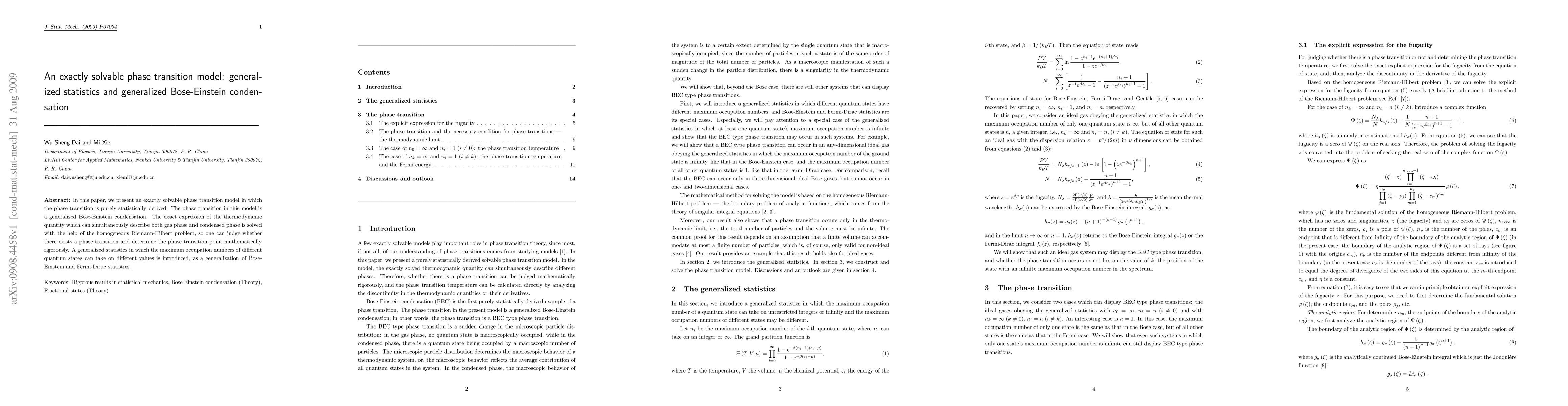 This paper introduces an exactly solvable phase transition model based on generalized statistics, demonstrating a generalized Bose-Einstein condensation. The model uses the homogeneous Riemann-Hilbert problem to rigorously determine the phase transition point and introduces a generalized statistic allowing different maximum occupation numbers for quantum states.