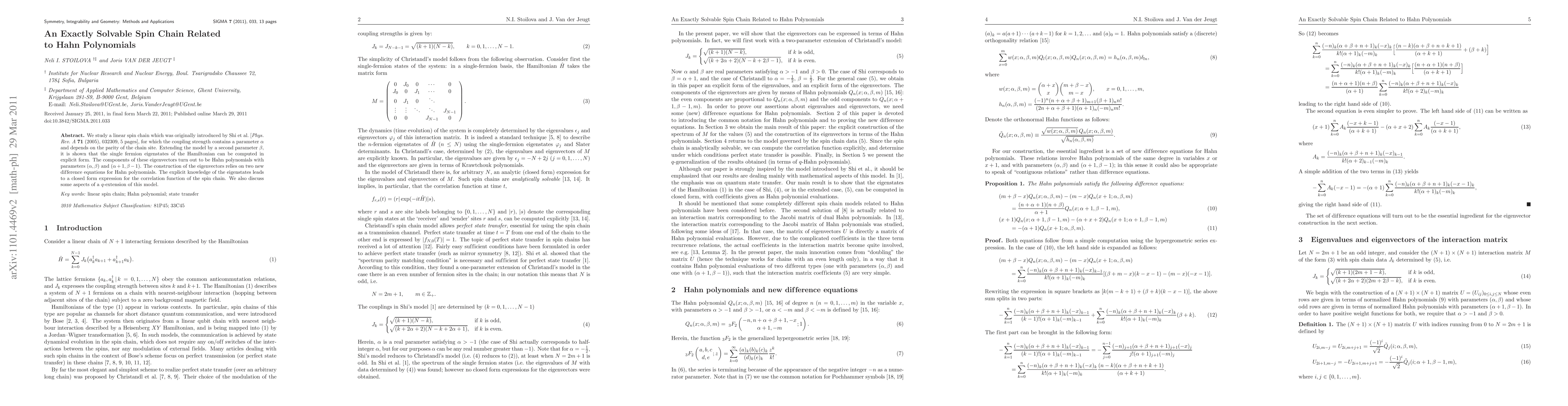 The paper presents an exactly solvable spin chain model with parameters α and β, where eigenstates are expressed using Hahn polynomials with specified parameters. The model allows for closed-form expressions of correlation functions and explores a q-extension, with eigenvector constructions based on novel difference equations for Hahn polynomials.