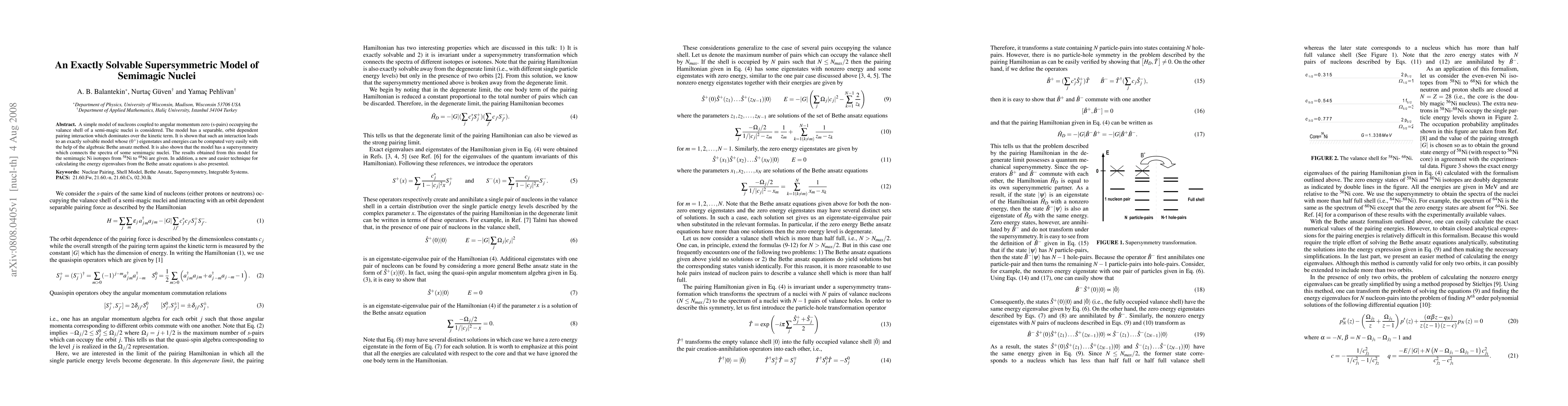 A simple model of nucleons coupled to angular momentum zero (s-pairs) occupying the valance shell of a semi-magic nuclei is considered. The model has a separable, orbit dependent pairing interaction which dominates over the kinetic term. It is shown that such an interaction leads to an exactly solvable model whose (0+) eigenstates and energies can be computed very easily with the help of the algebraic Bethe ansatz method. It is also shown that the model has a supersymmetry which connects the spectra of some semimagic nuclei. The results obtained from this model for the semimagic Ni isotopes from 58Ni to 68Ni are given. In addition, a new and easier technique for calculating the energy eigenvalues from the Bethe ansatz equations is also presented.