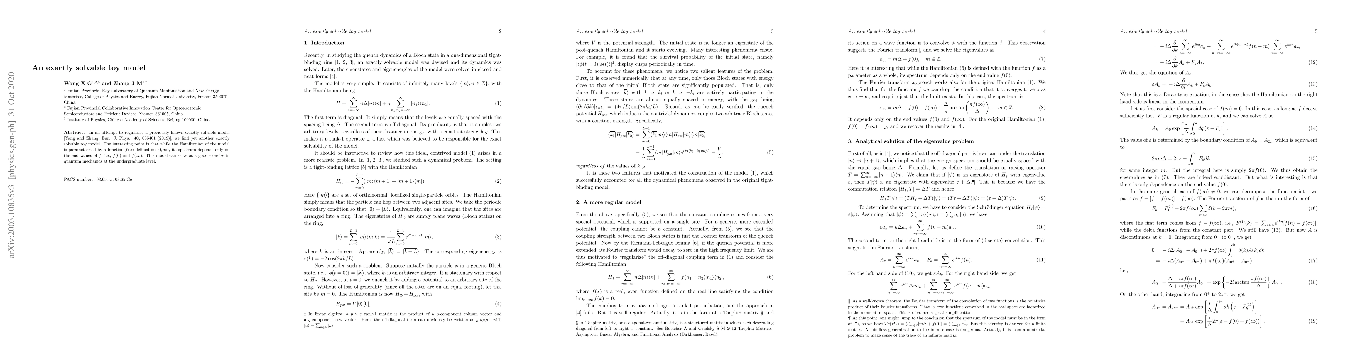 In an attempt to regularize a previously known exactly solvable model [Yang and Zhang, Eur. J. Phys. \textbf{40}, 035401 (2019)], we find yet another exactly solvable toy model. The interesting point is that while the Hamiltonian of the model is parameterized by a function $f(x)$ defined on $[0, \infty )$, its spectrum depends only on the end values of $f$, i.e., $f(0)$ and $f(\infty )$. This model can serve as a good exercise in quantum mechanics at the undergraduate level.