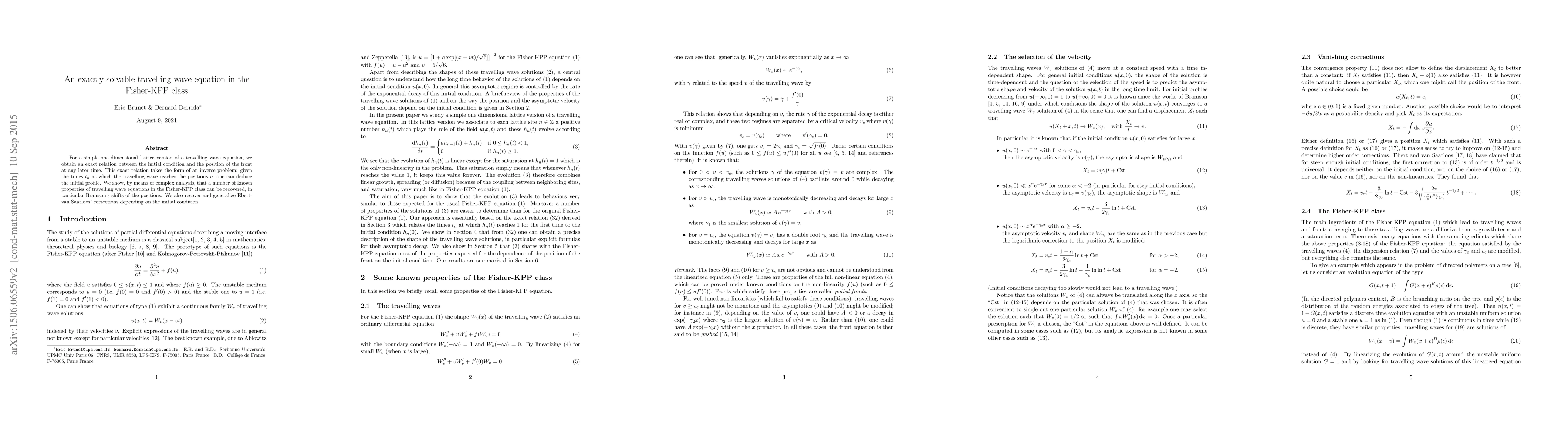 This paper provides an exact solution for a one-dimensional lattice travelling wave equation in the Fisher-KPP class, revealing an inverse relationship between initial conditions and wave front positions over time. Using complex analysis, it confirms known properties and generalizes previous corrections based on initial profiles.
