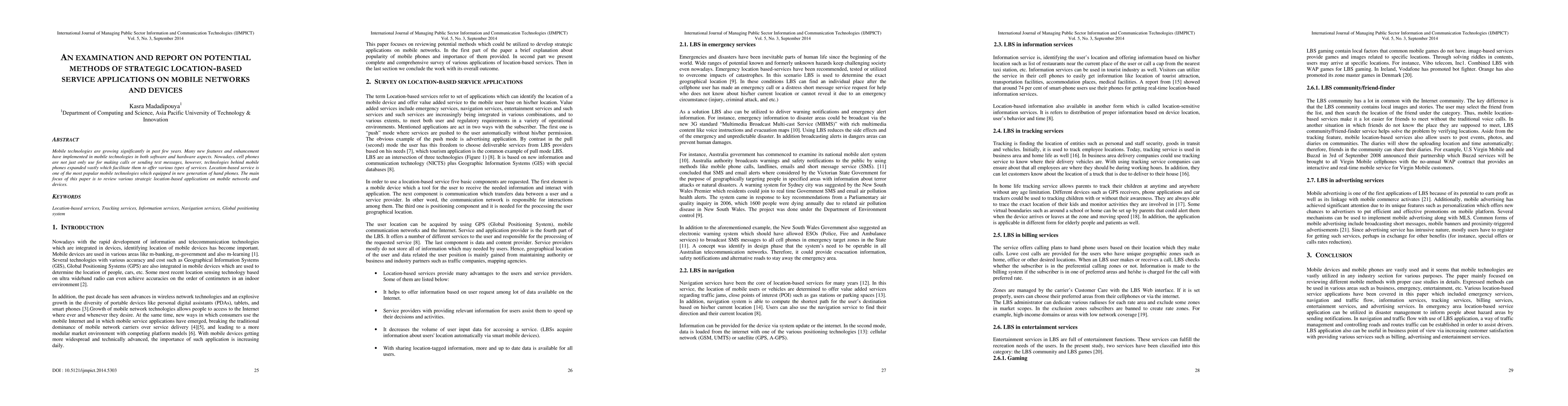 Mobile technologies are growing significantly in past few years. Many new features and enhancement have implemented in mobile technologies in both software and hardware aspects. Nowadays, cell phones are not just only use for making calls or sending text messages, however, technologies behind mobile phones expanded vastly which facilitate them to offer various types of services. Location-based service is one of the most popular mobile technologies which equipped in new generation of hand phones. The main focus of this paper is to review various strategic location-based applications on mobile networks and devices.