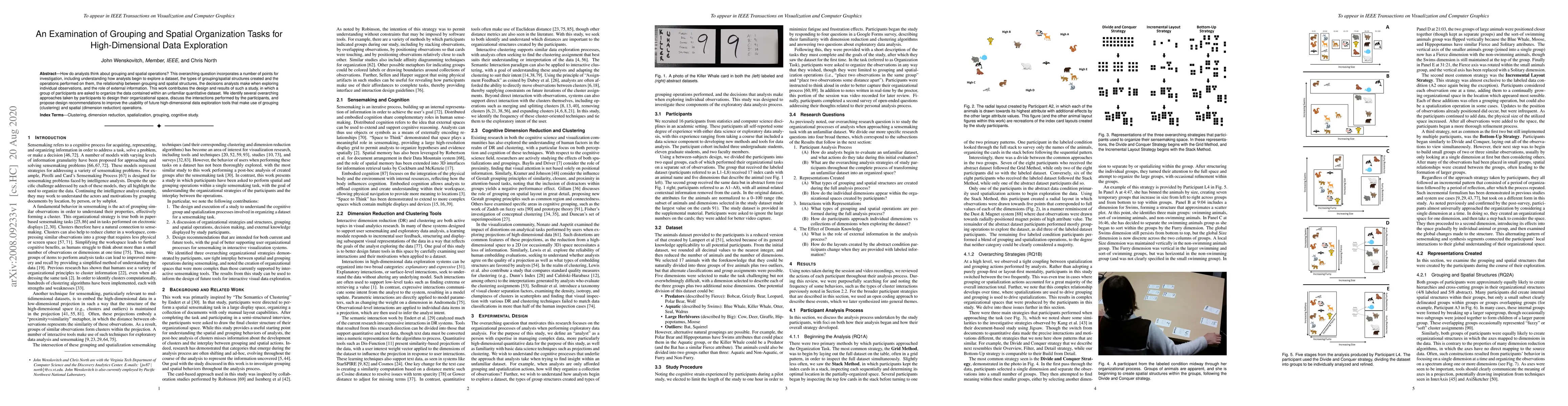 This study investigates how analysts explore high-dimensional data through grouping and spatial organization, identifying various approaches and interactions used by participants. The research proposes design recommendations to enhance the usability of future data exploration tools leveraging clustering and dimension reduction.