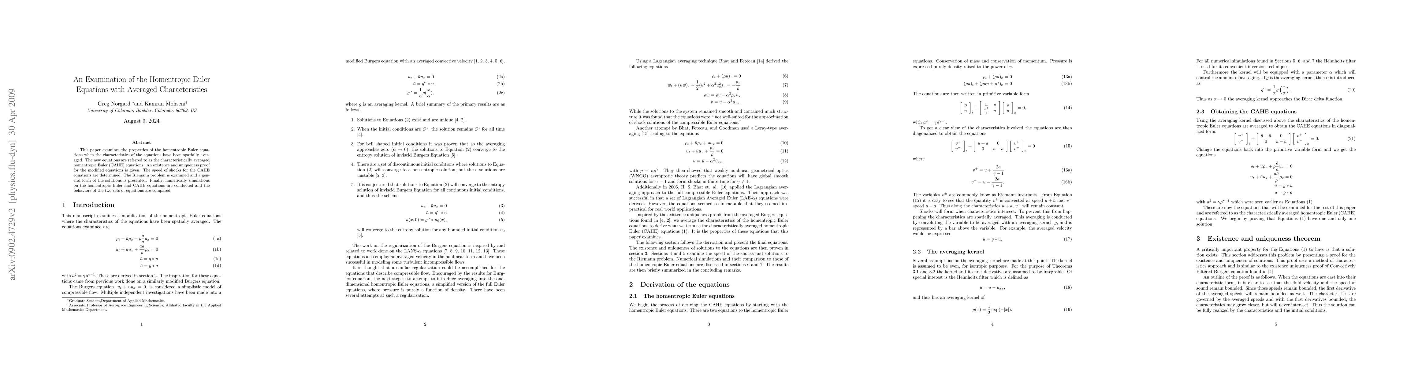 This paper investigates the properties of the characteristically averaged homentropic Euler (CAHE) equations, proving their existence and uniqueness, determining shock speeds, and examining the Riemann problem. Numerical simulations compare CAHE equations with traditional homentropic Euler equations.