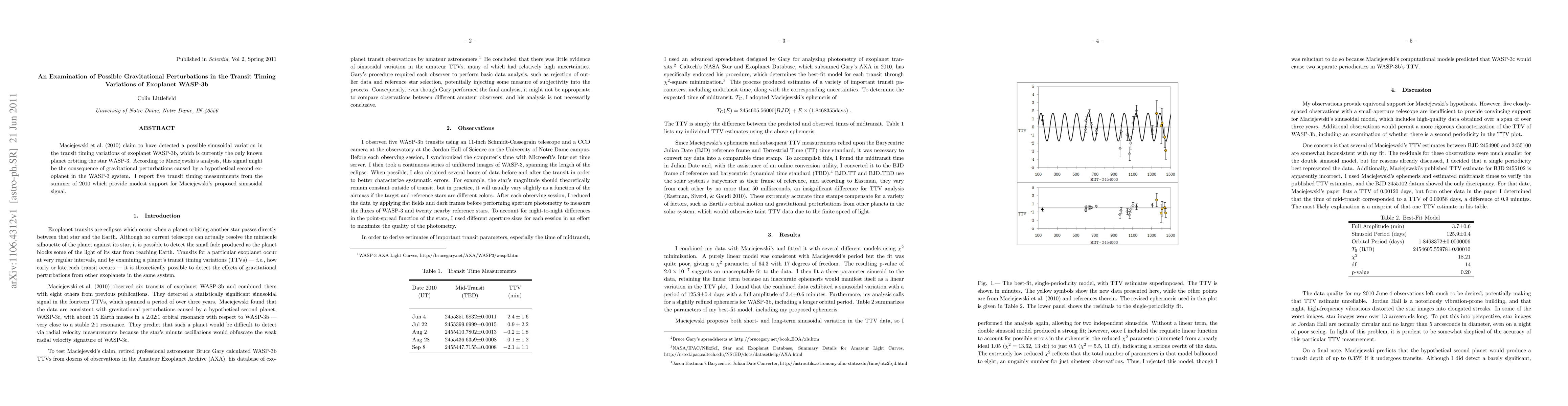 Maciejewski et al. (2010) detected a potential sinusoidal variation in the transit timing of WASP-3b, suggesting gravitational perturbations from a hypothetical second exoplanet. New transit timing measurements from summer 2010 offer modest support for this proposed signal.