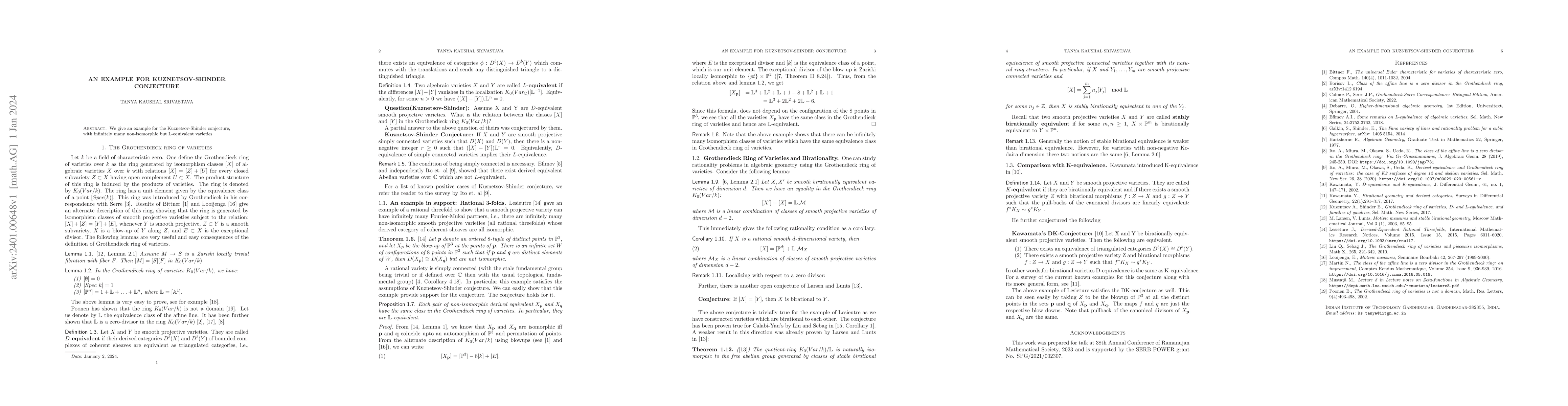 Summary: This paper presents an example supporting the Kuznetsov-Shinder conjecture by demonstrating infinitely many non-isomorphic varieties that are both D-equivalent and L-equivalent. The findings provide significant evidence for the conjecture's validity.