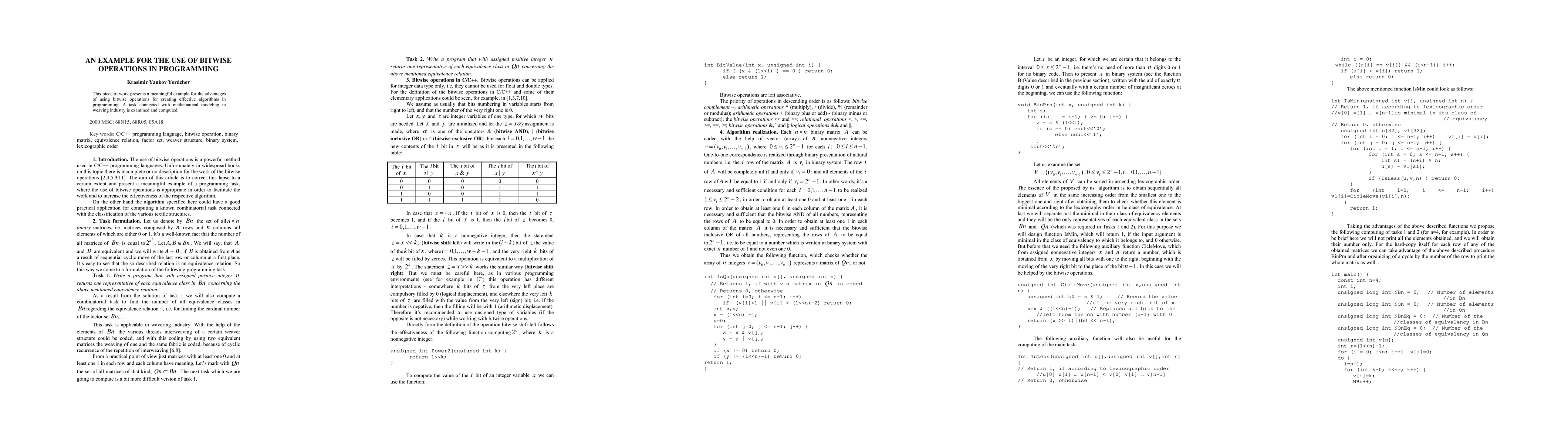This piece of work presents a meaningful example for the advantages of using bitwise operations for creating effective algorithms in programming. A task connected with mathematical modeling in weaving industry is examined and computed.