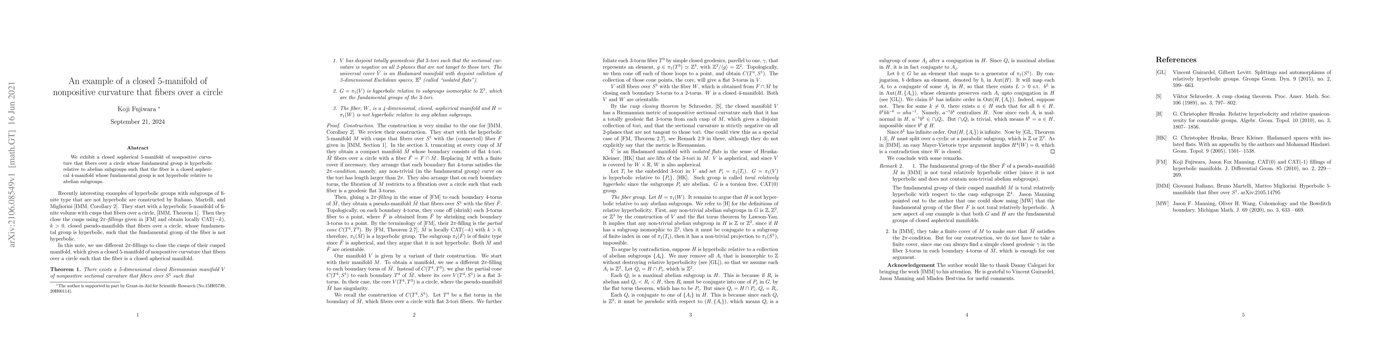 This paper presents a closed 5-manifold with nonpositive curvature that fibers over a circle, featuring a hyperbolic fundamental group relative to abelian subgroups, while its fiber—a closed aspherical 4-manifold—does not exhibit this hyperbolicity relative to abelian subgroups.