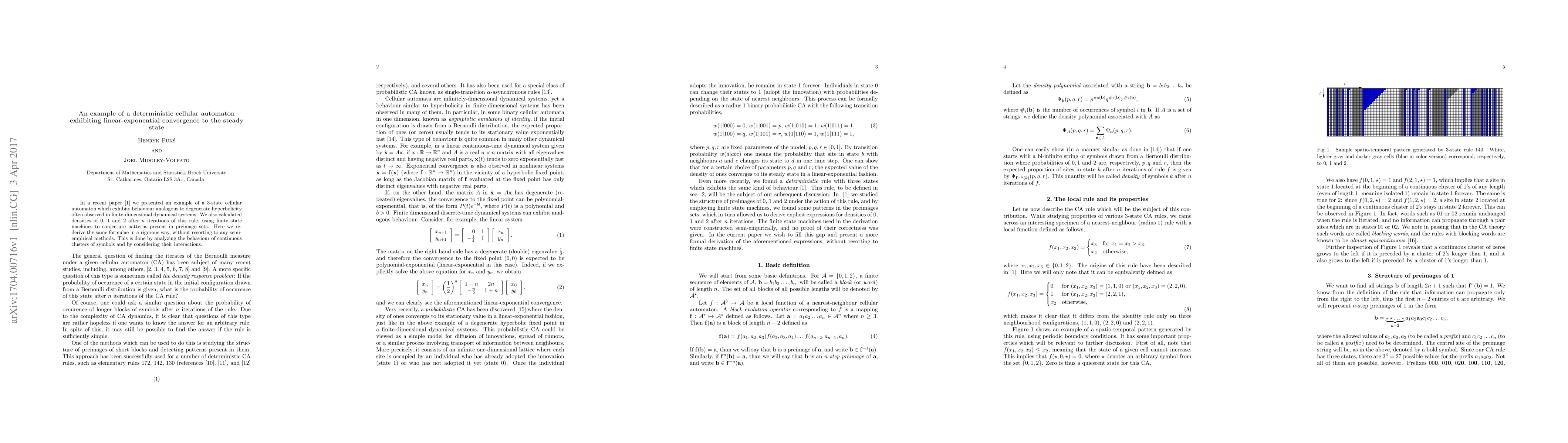 In a recent paper [arXiv:1506.06649 [nlin.CG]], we presented an example of a 3-state cellular automaton which exhibits behaviour analogous to degenerate hyperbolicity often observed in finite-dimensional dynamical systems. We also calculated densities of 0, 1 and 2 after n iterations of this rule, using finite state machines to conjecture patterns present in preimage sets. Here, we re-derive the same formulae in a rigorous way, without resorting to any semi-empirical methods. This is done by analysing the behaviour of continuous clusters of symbols and by considering their interactions.