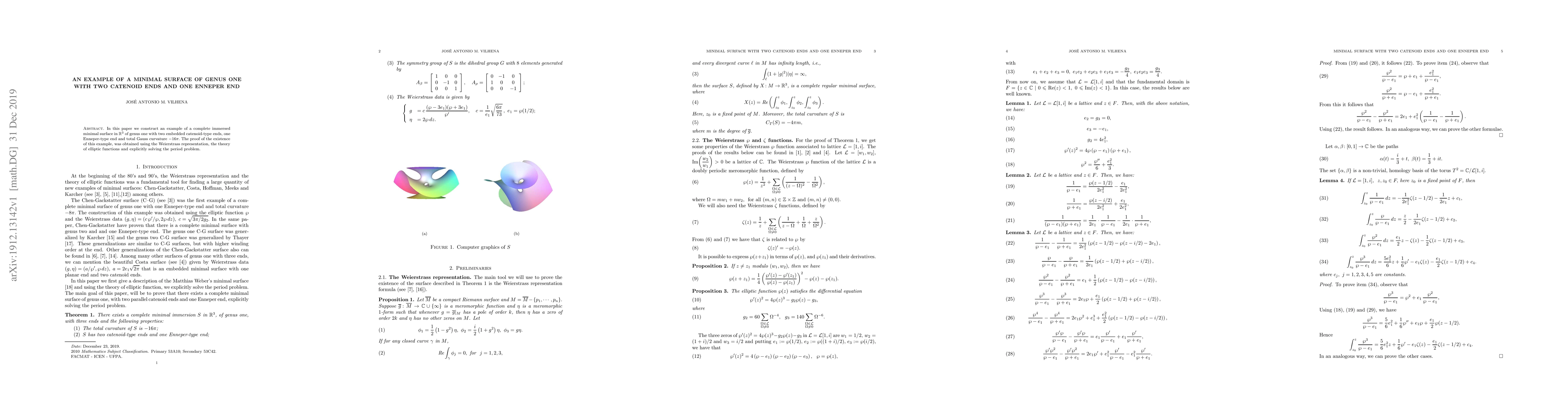 Researchers created a minimal surface in 3D space with genus one and two embedded catenoid-type ends, one Enneper-type end, and a negative curvature of -16π.