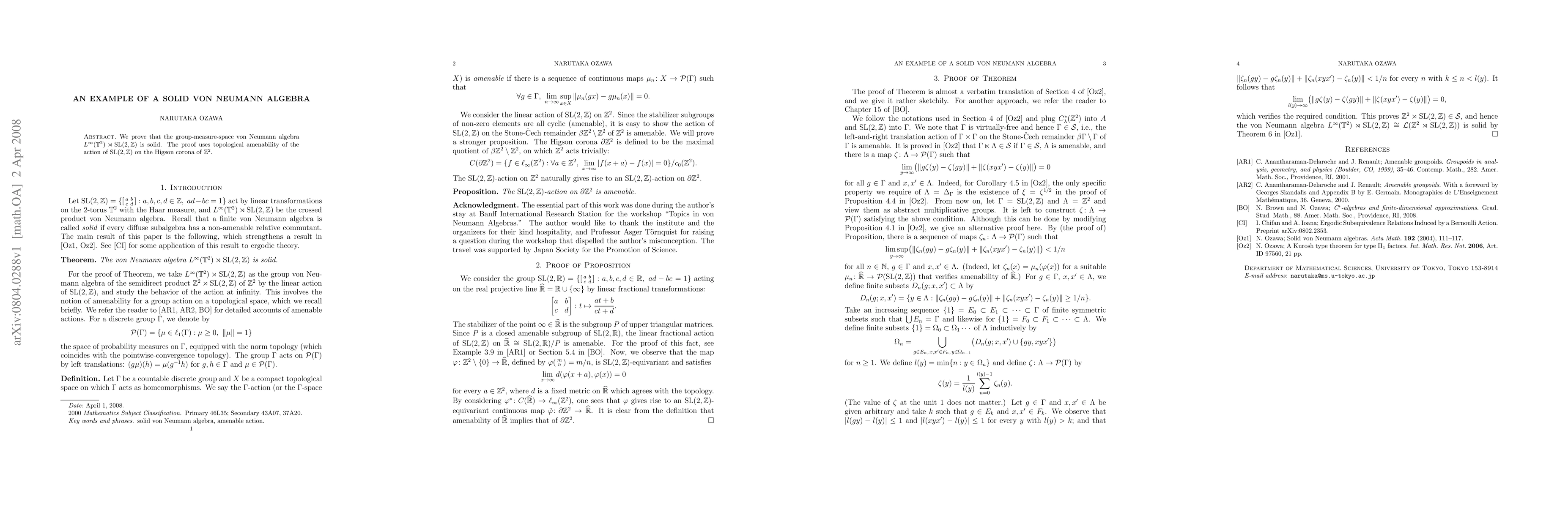 The paper proves that the group-measure-space von Neumann algebra $L^infty(T^2) \rtimes SL(2,Z)$ is solid. This is achieved by leveraging the topological amenability of $SL(2,Z)$'s action on the Higson corona of $Z^2$.