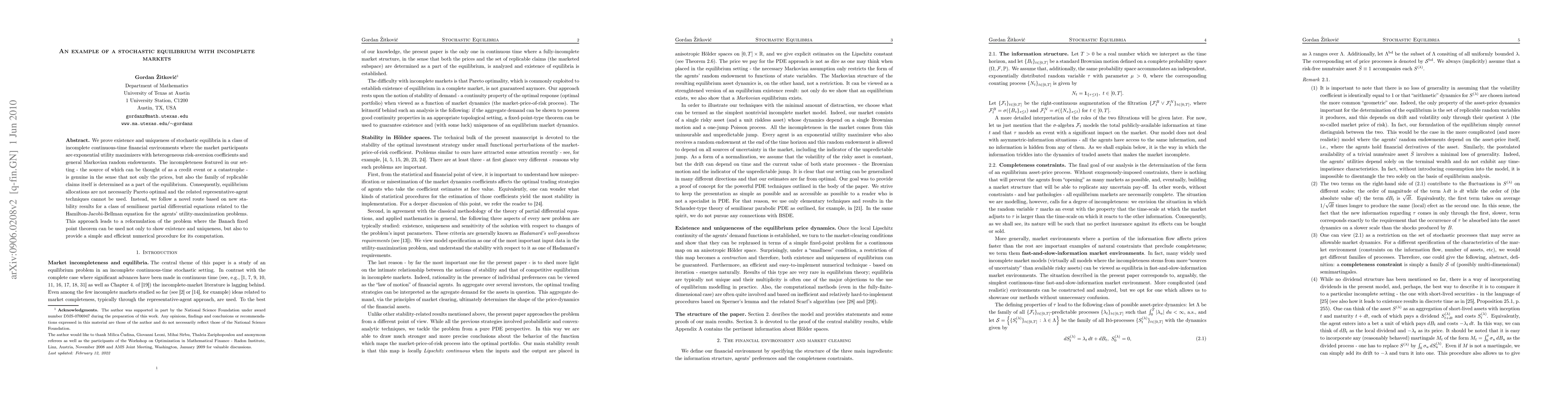 We prove existence and uniqueness of stochastic equilibria in a class of incomplete continuous-time financial environments where the market participants are exponential utility maximizers with heterogeneous risk-aversion coefficients and general Markovian random endowments. The incompleteness featured in our setting - the source of which can be thought of as a credit event or a catastrophe - is genuine in the sense that not only the prices, but also the family of replicable claims itself is determined as a part of the equilibrium. Consequently, equilibrium allocations are not necessarily Pareto optimal and the related representative-agent techniques cannot be used. Instead, we follow a novel route based on new stability results for a class of semilinear partial differential equations related to the Hamilton-Jacobi-Bellman equation for the agents' utility-maximization problems. This approach leads to a reformulation of the problem where the Banach fixed point theorem can be used not only to show existence and uniqueness, but also to provide a simple and efficient numerical procedure for its computation.