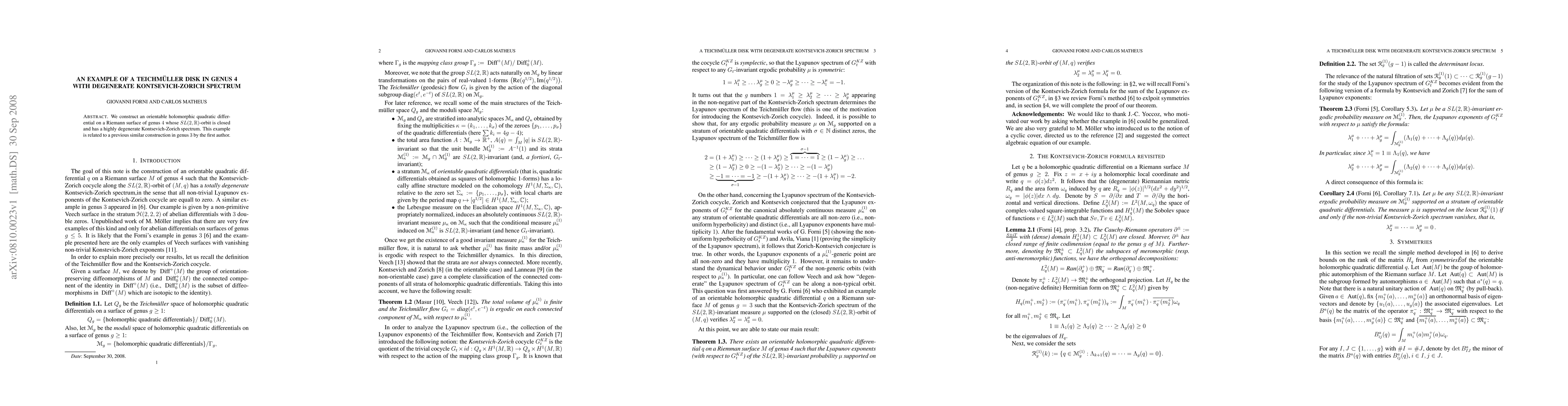 Summary: The paper constructs a closed SL(2,R)-orbit of a holomorphic quadratic differential on a genus 4 Riemann surface, showcasing a highly degenerate Kontsevich-Zorich spectrum, extending a similar genus 3 example from prior work by the first author.
