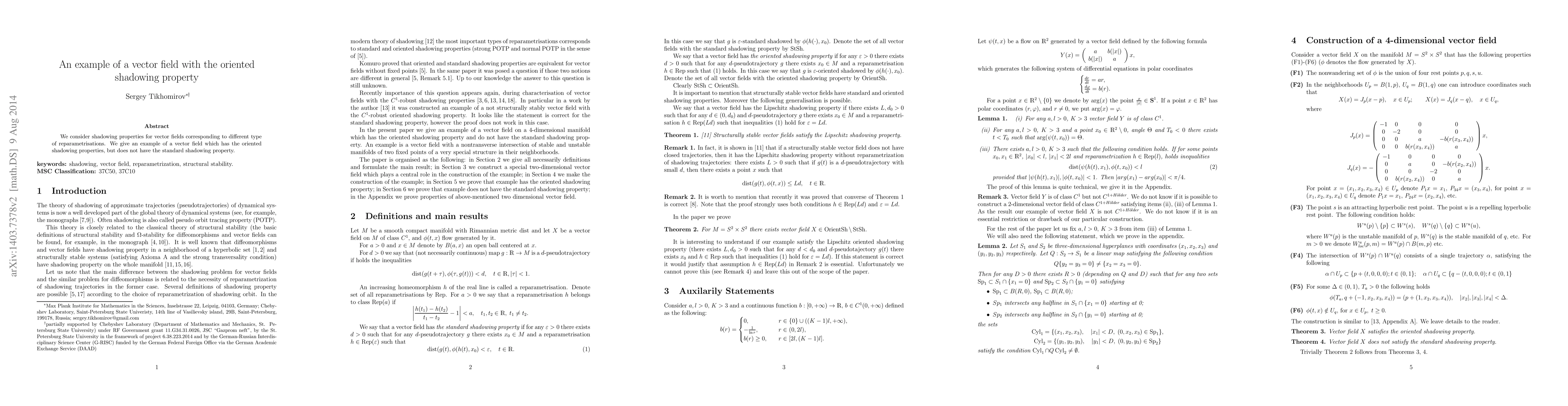 The paper constructs a 4-dimensional vector field X on the manifold M=S2×S2 with specific properties (F1)-(F6), demonstrating the oriented shadowing property while lacking the standard shadowing property.