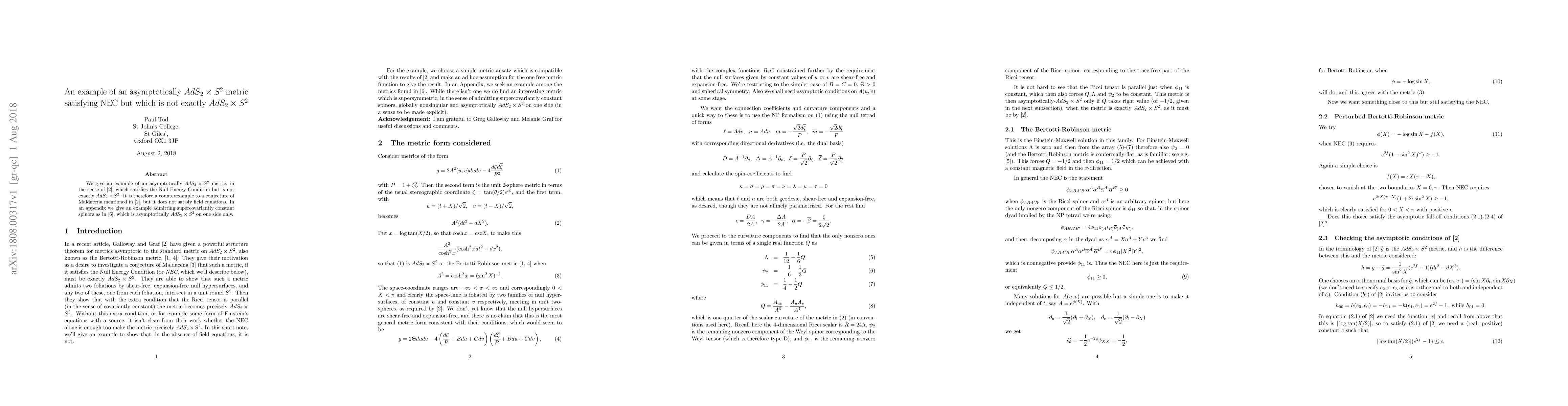 Summary: The paper presents a metric asymptotically resembling $AdS_2\times S^2$ that satisfies the Null Energy Condition but deviates from the exact $AdS_2\times S^2$ form, providing a counterexample to a conjecture by Maldacena, while also offering an example with supercovariantly constant spinors.