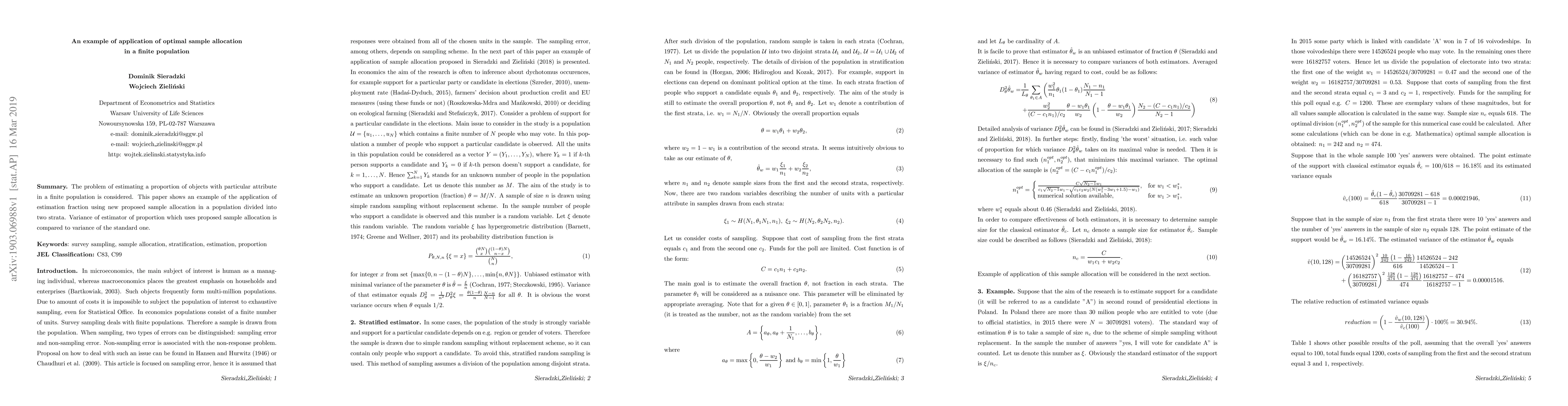 The problem of estimating a proportion of objects with particular attribute in a finite population is considered. This paper shows an example of the application of estimation fraction using new proposed sample allocation in a population divided into two strata. Variance of estimator of proportion which uses proposed sample allocation is compared to variance of the standard one.