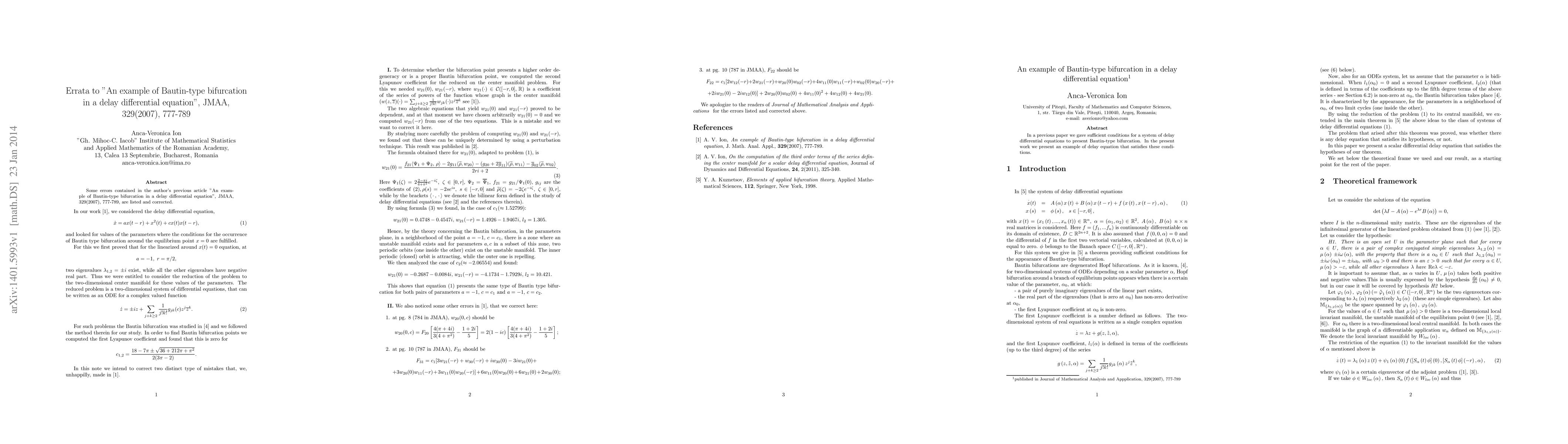 Some errors contained in the author's previous article "An example of Bautin-type bifurcation in a delay differential equation", JMAA, 329(2007), 777-789, are listed and corrected. Original abstract: In a previous paper we gave sufficient conditions for a system of delay differential equations to present Bautin-type bifurcation. In the present work we present an example of delay equation that satisfies these conditions.