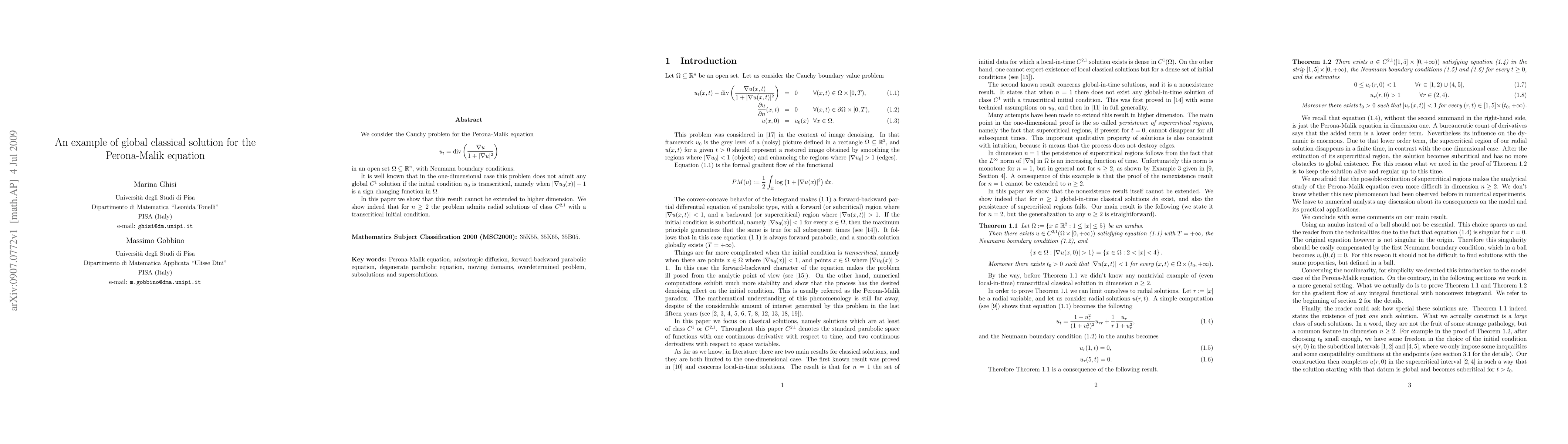 Researchers found that the Perona-Malik equation in higher dimensions (n >= 2) can have global solutions with a transcritical initial condition, unlike its one-dimensional case where no such solution exists.