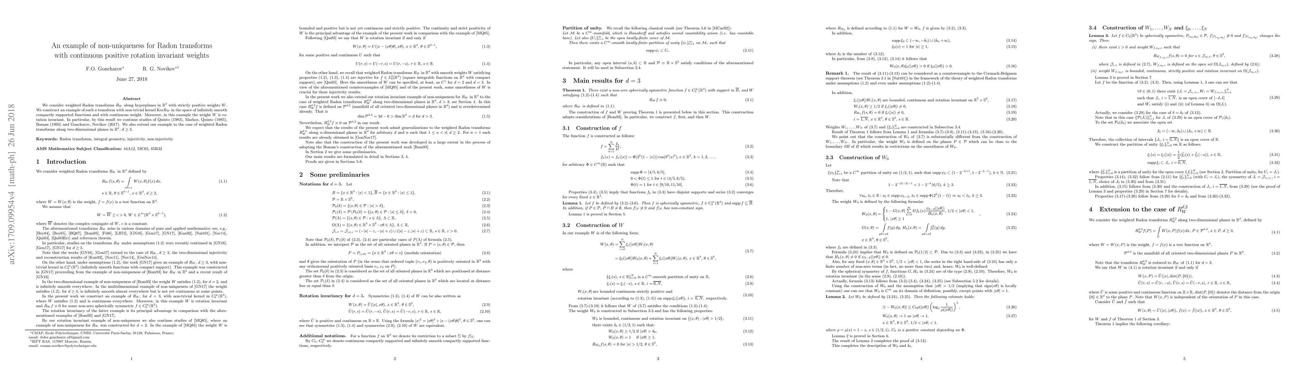 We consider weighted Radon transforms $R_W$ along hyperplanes in $R^3$ with strictly positive weights $W$. We construct an example of such a transform with non-trivial kernel $\mathrm{Ker}R_W$ in the space of infinitely smooth compactly supported functions and with continuous weight. Moreover, in this example the weight $W$ is rotation invariant. In particular, by this result we continue studies of Quinto (1983), Markoe, Quinto (1985), Boman (1993) and Goncharov, Novikov (2017). We also extend our example to the case of weighted Radon transforms along two-dimensional planes in $R^d$ , $d \geq 3$.