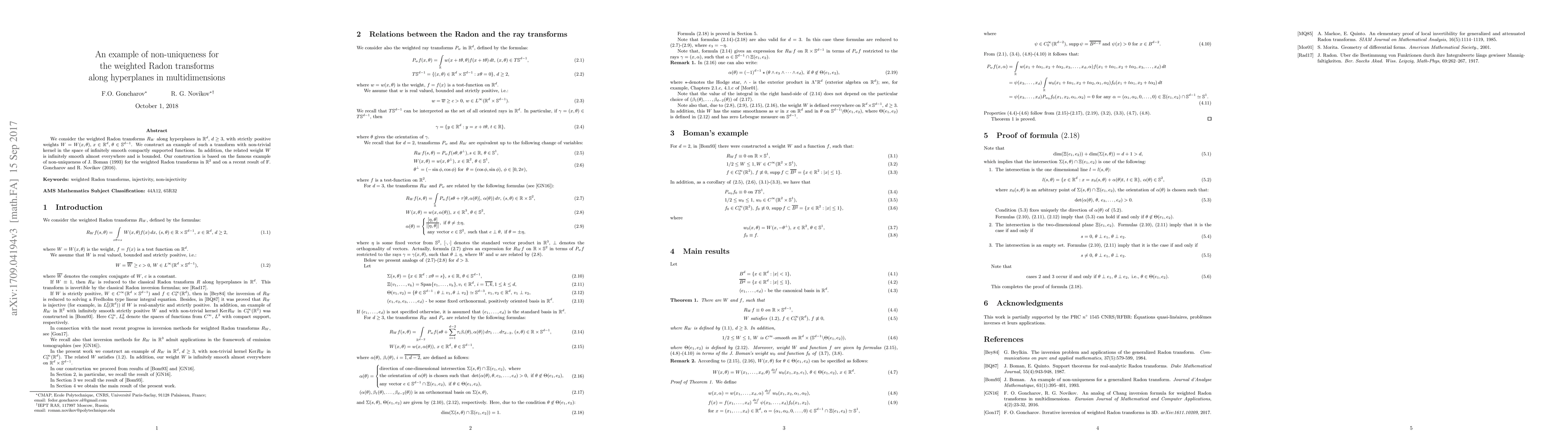 We consider the weighted Radon transforms $R_W$ along hyperplanes in $R^d, \, d \geq 3$, with strictly positive weights $W = W (x, \theta), \, x \in R^d, \, \theta \in S^{d-1}$. We construct an example of such a transform with non-trivial kernel in the space of infinitely smooth compactly supported functions. In addition, the related weight $W$ is infinitely smooth almost everywhere and is bounded. Our construction is based on the famous example of non-uniqueness of J. Boman (1993) for the weighted Radon transforms in $R^2$ and on a recent result of F. Goncharov and R. Novikov (2016).