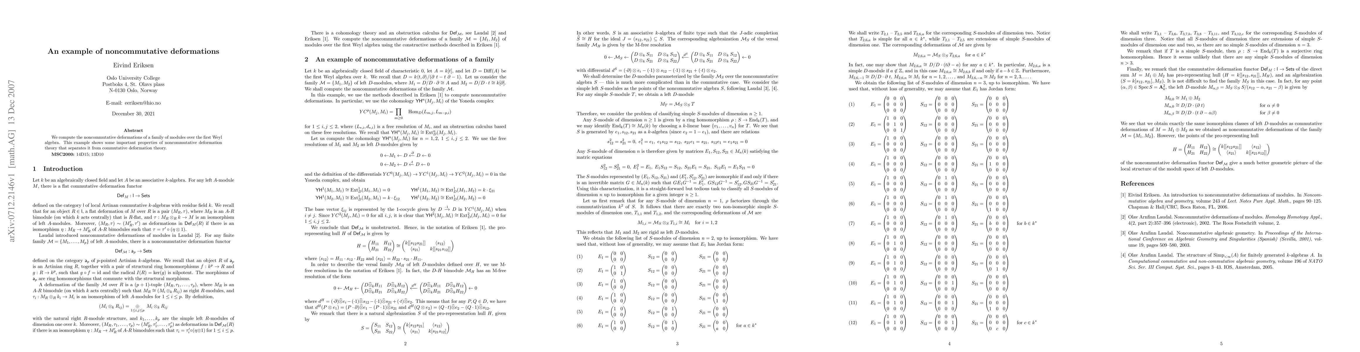 We compute the noncommutative deformations of a family of modules over the first Weyl algebra. This example shows some important properties of noncommutative deformation theory that separates it from commutative deformation theory.