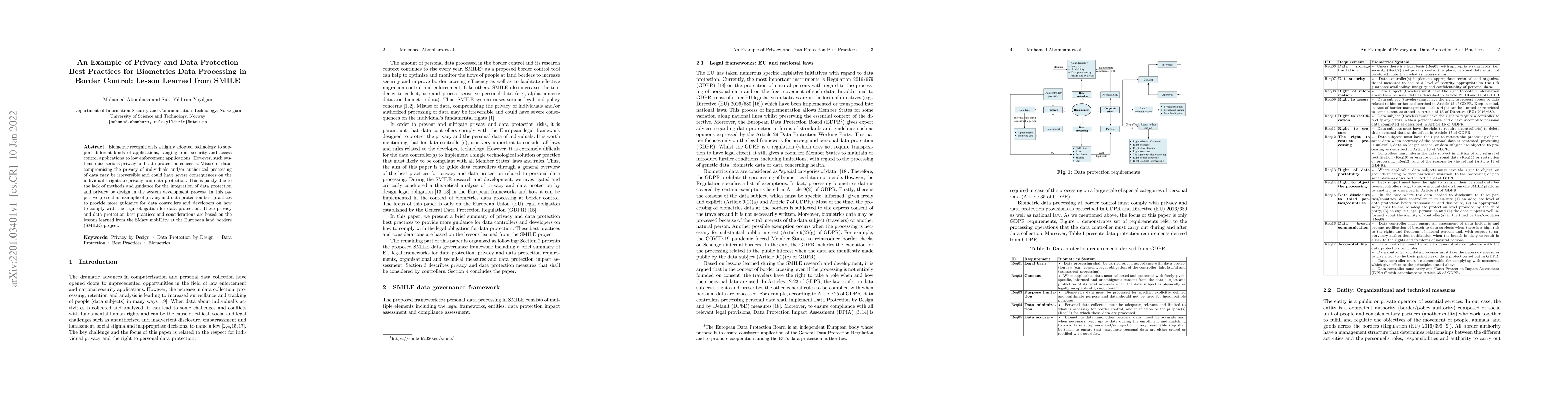 Biometric recognition is a highly adopted technology to support different kinds of applications, ranging from security and access control applications to low enforcement applications. However, such systems raise serious privacy and data protection concerns. Misuse of data, compromising the privacy of individuals and/or authorized processing of data may be irreversible and could have severe consequences on the individual's rights to privacy and data protection. This is partly due to the lack of methods and guidance for the integration of data protection and privacy by design in the system development process. In this paper, we present an example of privacy and data protection best practices to provide more guidance for data controllers and developers on how to comply with the legal obligation for data protection. These privacy and data protection best practices and considerations are based on the lessons learned from the SMart mobILity at the European land borders (SMILE) project.